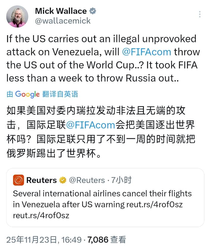 欧洲议会议员米克·华莱士11月23日发文问道:“如果美国对委内瑞拉发动非法且无端的攻击,国际足联会把美国逐出世界杯吗?国际足联只用了不到一周的时间就把俄罗斯踢出了世界杯。” 2022年俄乌刚打起来,国际足联立马跳出来,说“受局势影响”,干脆利落地把俄罗斯队拦在世界杯预选赛门外,连去中立场地比赛的机会都没给。当时发的声明一本正经,好像多讲究体育公平似的。可再往回倒二十年,美国干的事比这离谱多了,国际足联却闷不吭声,连个屁都没放。 2003年3月,美国连联合国安理会的授权都没有,就拉着英国把战火泼到伊拉克。这场没理的仗打下来,近20万伊拉克老百姓没了命,到2023年还有120万人无家可归,伊拉克的土地到现在都坑坑洼洼。 要是按国际足联罚俄罗斯的逻辑,美国早该被钉在体育制裁的耻辱柱上了吧?结果呢?2006年德国世界杯,美国队该踢踢该跑跑,小组赛赢了加纳、平了意大利,一路闯进16强。国际足联别说把它赶走,连句重话都没说过。 更讽刺的是,明年世界杯在美加墨三国办,美国简直是主角中的主角。11座城市拿下了承办权,从纽约的大都会球场到洛杉矶的索菲体育场,早就把草坪翻修好了,门票也卖得热火朝天。 对比之下,加拿大才2座,墨西哥3座,谁是世界杯的“大金主”,明眼人一看就懂。一边是打了非法战争啥事儿没有,一边还能风风光光当东道主,这待遇和俄罗斯比,简直是一个天上一个地下。 有人替国际足联找补,说“俄罗斯是战时被禁”,可美国打伊拉克那会儿,巴格达的爆炸声比现在响多了。国际足联当时装哑巴,说白了就是看人下菜碟,俄罗斯是西方的“眼中钉”,罚它能讨主流舆论欢心;美国可是全球体育圈的“提款机”,单是美国市场的转播费,就占了世界杯收入的一半,谁真敢跟钱过不去? 再说说委内瑞拉,这些年美国对它的制裁、军事威胁就没断过。真要是哪一天美国撕破脸动手了,国际足联会罚吗?答案八成是“不会”。就看现在这架势,美国足协和国际足联好得穿一条裤子,连世界杯选裁判这种事,美国都能沾光,怎么可能因为美国打了仗就把它赶走? “体育无关政治”这话,我们听了几十年,可国际足联的操作,硬是把它改成了“体育只看谁拳头硬”。俄罗斯的球员没做错啥,却要为国家的事买单,连踢球的资格都没了;美国打了公认的非法战争,却能在世界杯的舞台上稳稳坐着,甚至当主人。 华莱士的问题,其实根本不用等答案,在这双标的世界里,规矩从来都是给弱者定的。可惜了那些一心踢球的运动员,也可惜了我们这些信“公平竞赛”的观众,总被这种现实泼冷水,心里堵得慌。