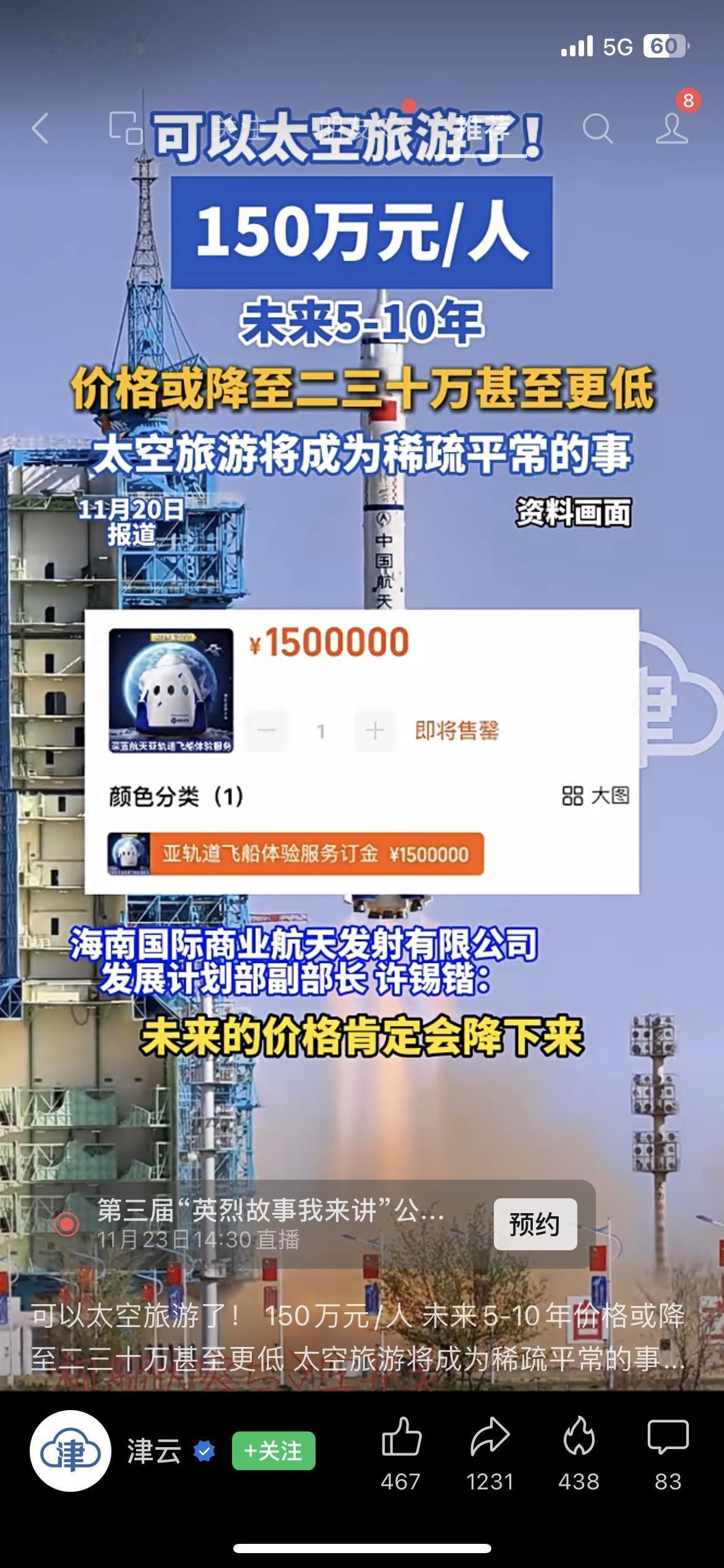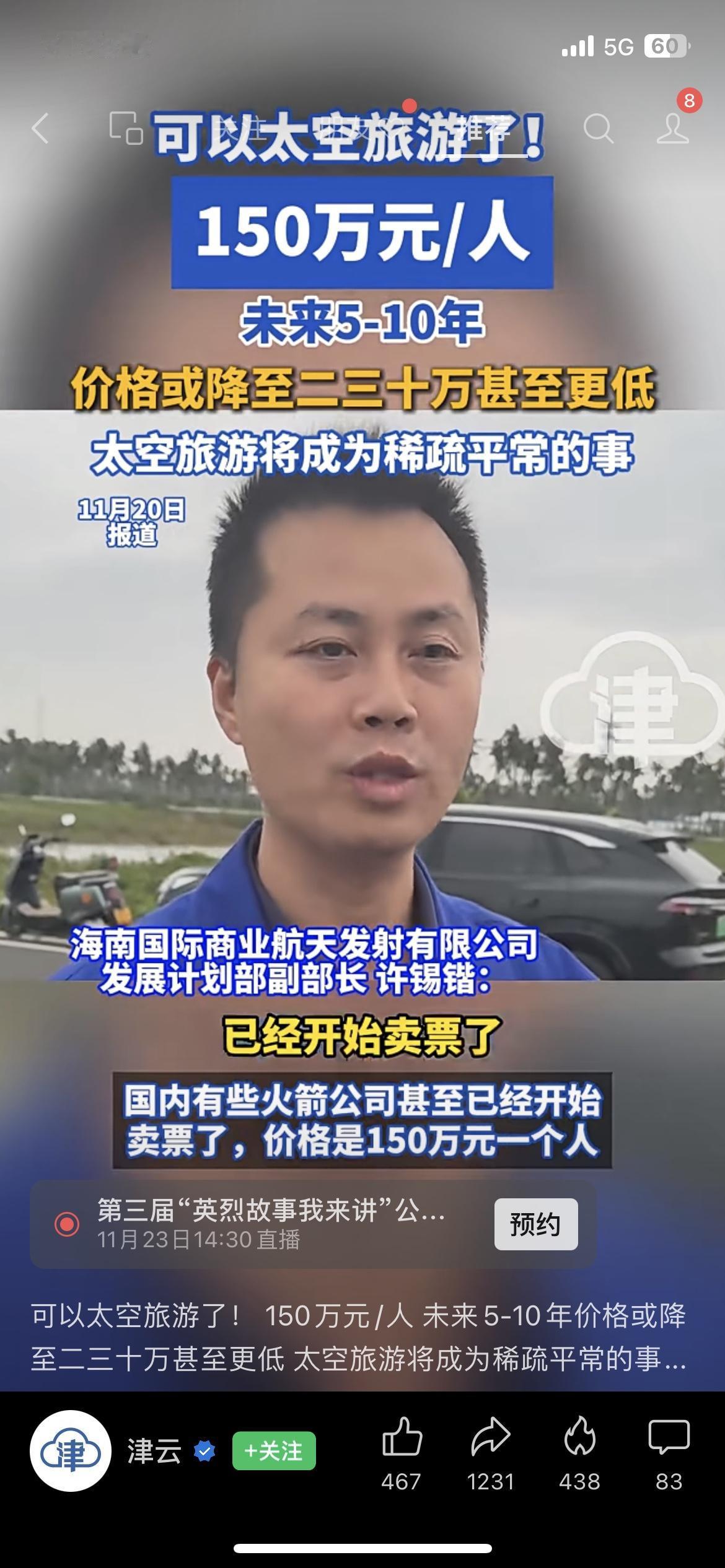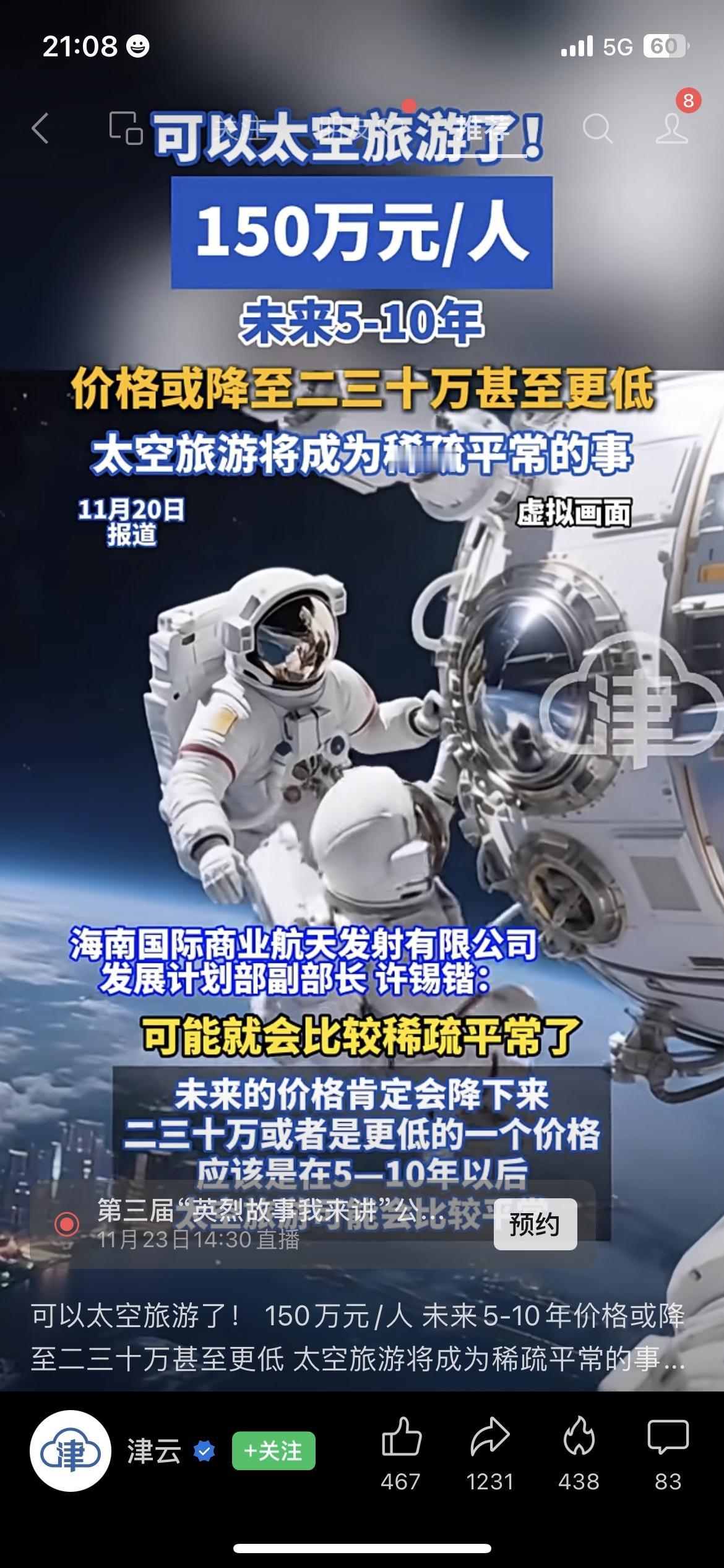 家人们!咱国内太空旅游真的能买票了!刚刷到海南商业航天的消息——现在亚轨道飞行体验直接卖票,150万/人,已经有火箭公司开始接单了! 更炸的是,人家负责人说未来5-10年,这价格能降到二三十万甚至更低!到时候太空旅游可能跟现在坐个飞机出差似的,成稀松平常的事儿… 我算算账:现在150万是真贵,但要是十年后二三十万,普通中产是不是也能冲一波?到时候坐火箭上天看地球曲率、体验失重,想想都爽啊! 不过话说回来,这价格降得下来吗?你们觉得十年后真能花二三十万上天旅游不?评论区聊聊,我先蹲个“未来太空游搭子”! 太空旅游 海南商业航天 天价体验 未来科技 离谱但真实太空门票 太空旅行成本