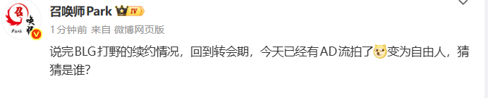 召唤师Park瓜:说完BLG打野的续约情况,回到转会期,今天已经有AD流拍了变为自由人,猜猜是谁?