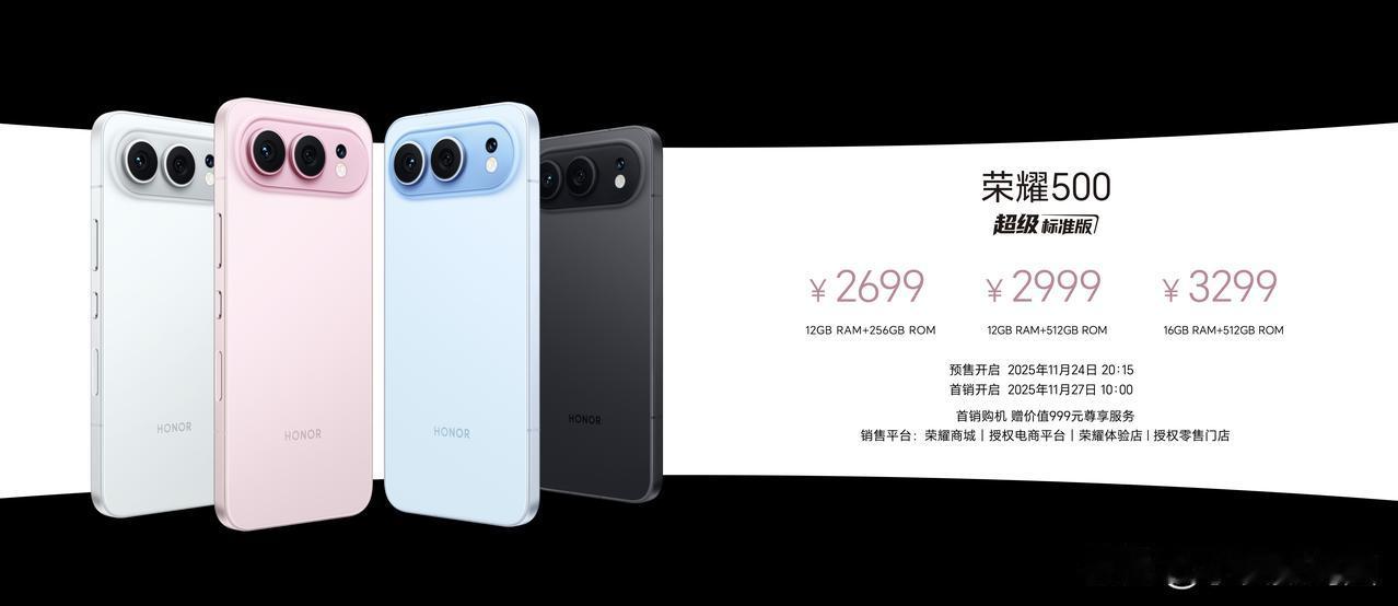荣耀500直接掀桌子!起步价2699却全系超标配置 今天荣耀500系列正式开启预售,四款配色海蓝宝、星光粉、月光银、曜石黑全部上线。标准版12+256G仅2699元,Pro版顶配16+1TB也才4799元,这价格让友商怎么玩? 最狠的是全系标配12GB运存,彻底告别安卓机卡顿时代。标准版三款配置差价仅300元,明显是在引导用户直接上顶配。Pro版四个档位更是把性价比拉满,16+1TB不到4800,这波价格屠夫操作实在漂亮。 11月27日十点全渠道开售,估计又要秒空。荣耀这次是真的把旗舰配置打到3000元价位,中端机市场要重新洗牌了。