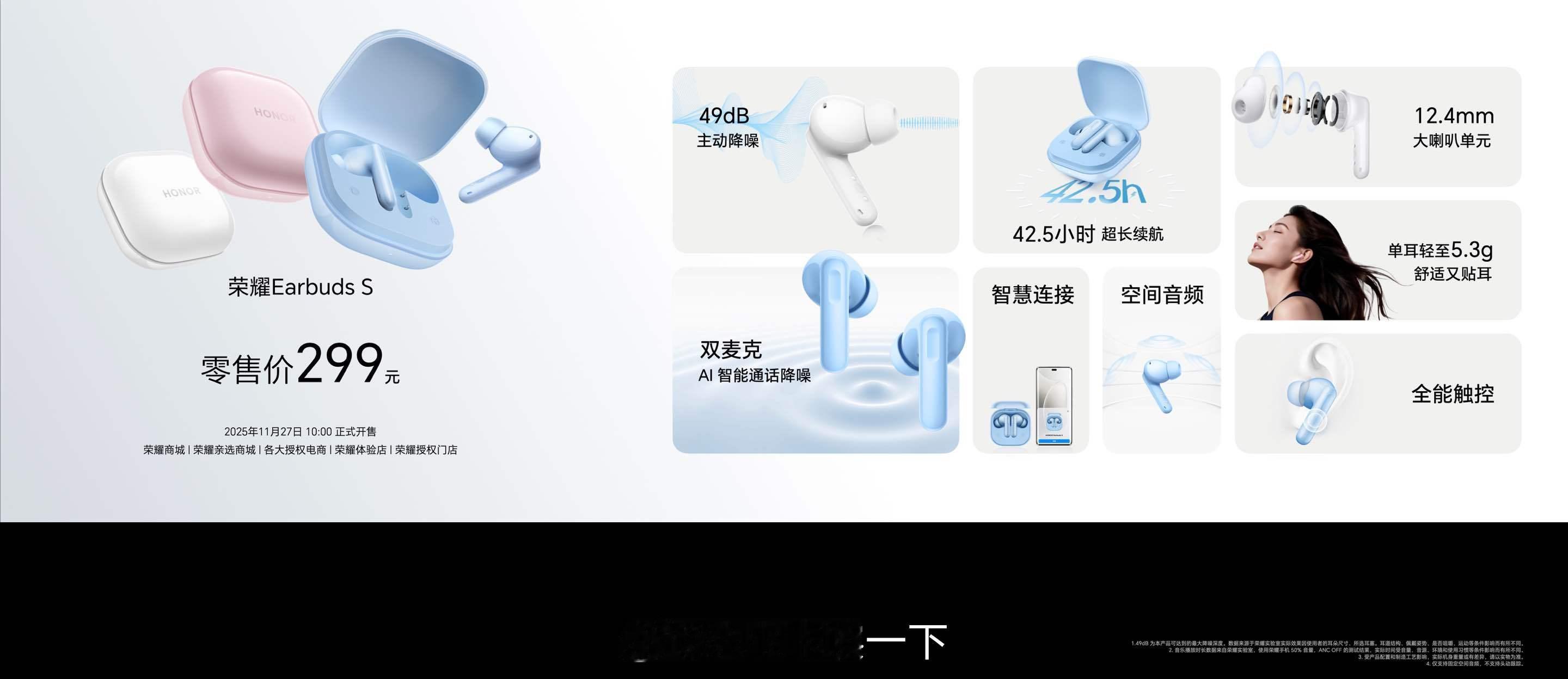 时尚多彩的荣耀Earbuds S耳机,拥有49dB深度降噪,超长续航可达42.5小时,确保用户无论身何处依然能听得清楚、讲的清晰,11月27日 10:00首销价299元。