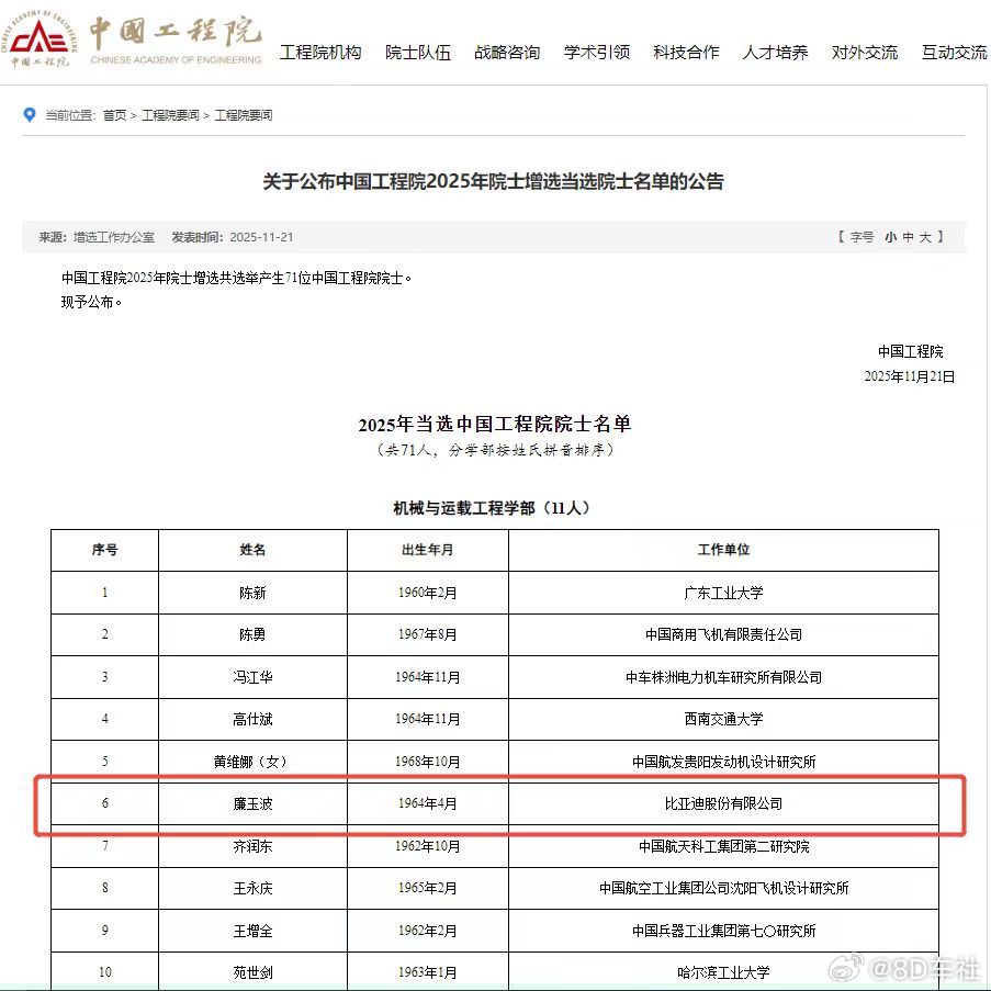 比亚迪集团首席科学家廉玉波当选中国工程院院士2025年11月21日,中国工程院公布了2025年院士增选结果。比亚迪集团首席科学家、汽车总工程师、汽车工程研究院院长廉玉波当选中国工程院院士。廉玉波长期致力于新能源汽车关键系统及整车研发工作,取得一系列核心技术突破,为推动中国汽车产业高质量发展贡献更大力量。
