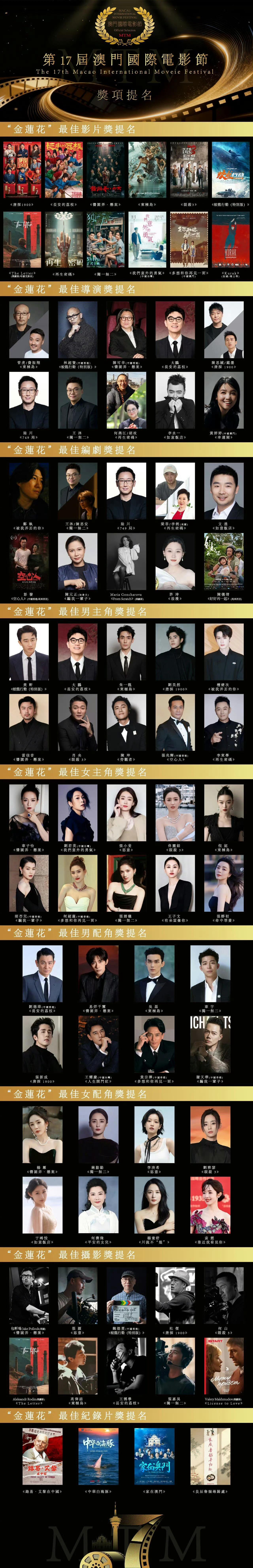 第17届澳门国际电影节“金莲花奖”奖项提名公布↓ 《唐探1900》《长安的荔枝》《东极岛》《独一无二》《酱园弄·悬案》等提名最佳影片,朱一龙、刘昊然、檀健次等提名最佳男主角,章子怡、张婧仪、张小斐、倪妮等提名最佳女主角,易烊千玺、刘德华、吴磊、黄宗泽等提名最佳男配角,杨幂、蒋勤勤、李庚希、刘雅瑟等提名最佳女配角。