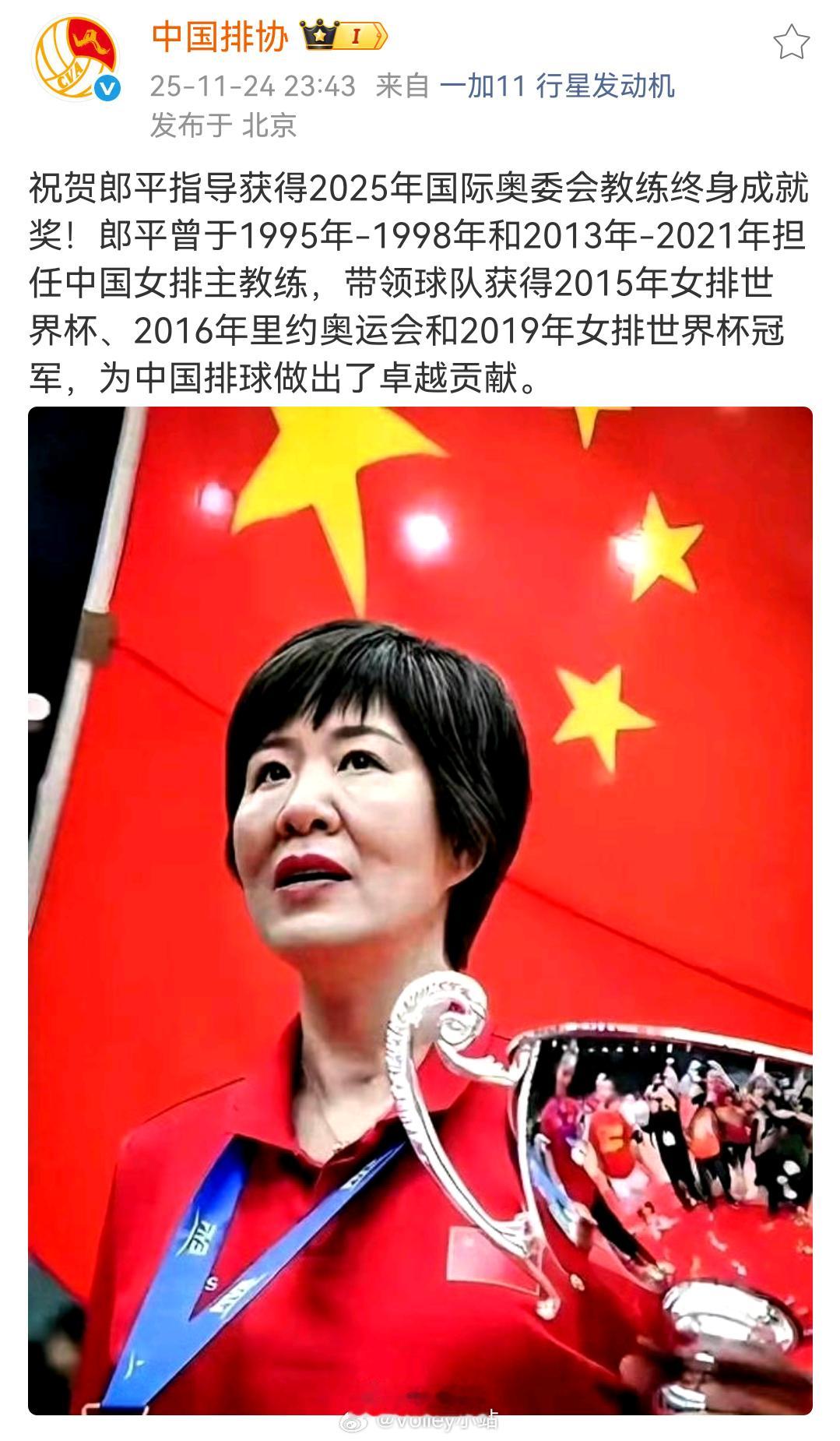 中国排协祝贺郎导获得2025年国际奥委会教练终身成就奖