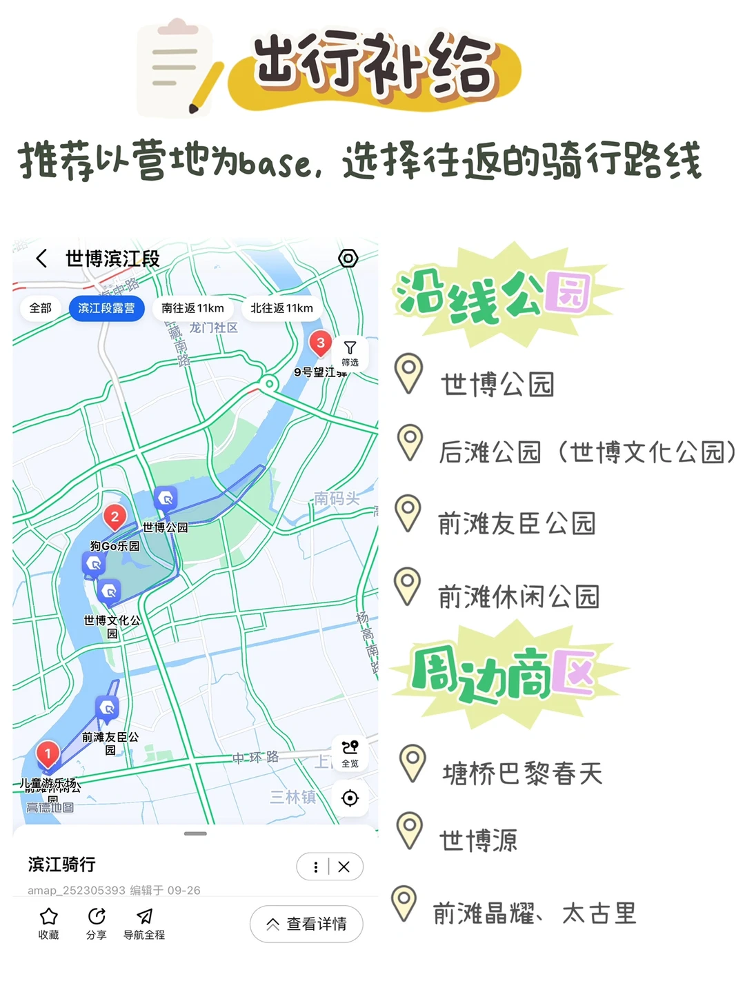 2 横跨10km的后滩滨江路段,由北到南的世博公园、后滩公园、前滩友臣公园、前滩休闲公园都可以扎营;