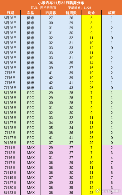 11月22日跳周数据整理。本轮跳周主要以YU7 MAX为主,其它两个车型调整幅度不大,关于跳周的更多说明可参考置顶,本次就不展开了