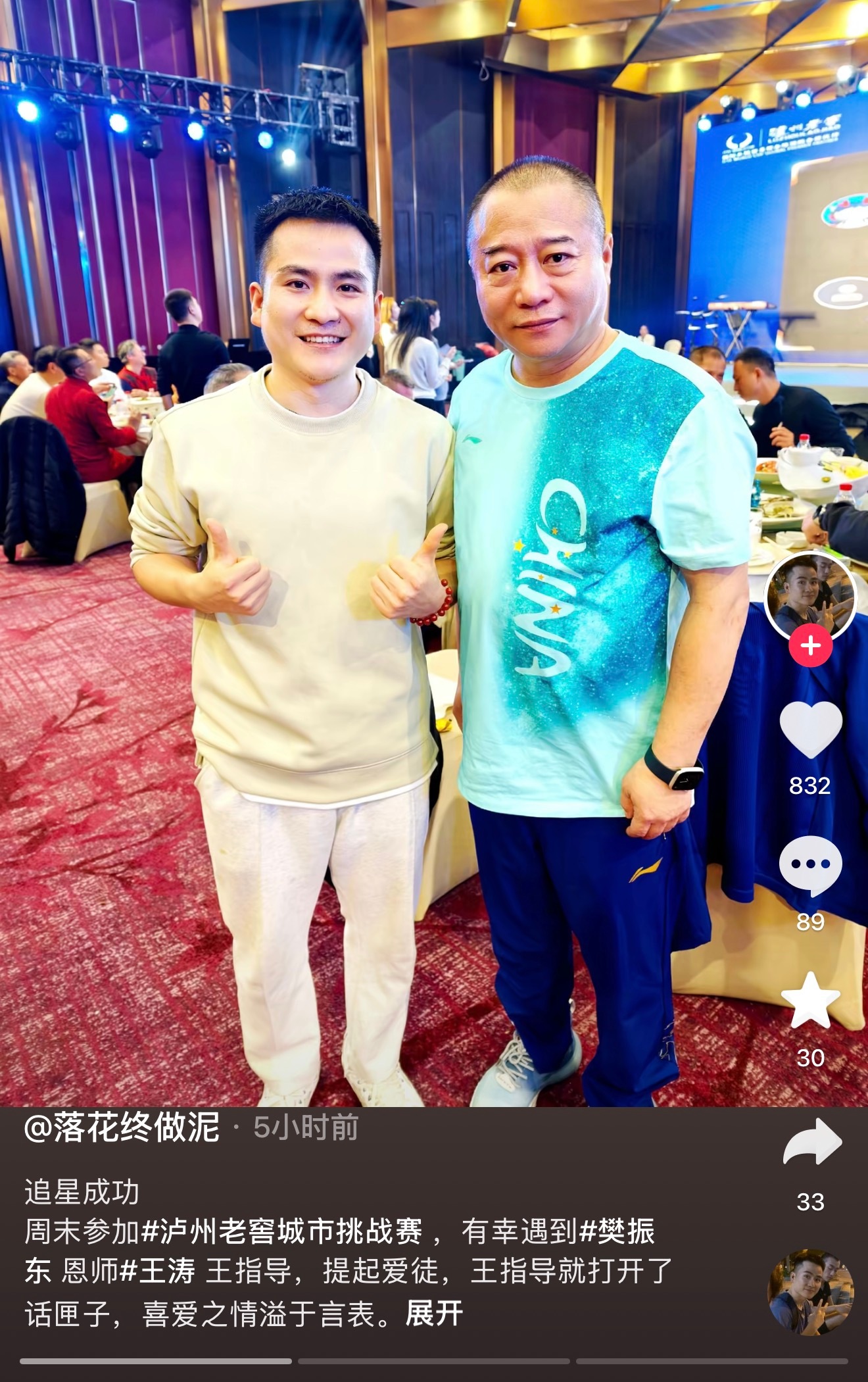 网友参加挑战赛遇到王涛,谈话内容:“夸东哥,夸东哥,还是夸东哥”