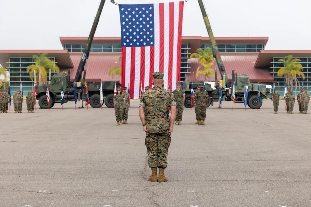 美国军营里自始至终都是把爱国放在第一位。美国人一句俗语:“有仪式的地方就会有美国国旗。” 2025年10月24日,美国海军陆战队少校杰弗里·J·梅德罗斯(Jeffrey J. Medeiros),第11海军远征单位第11作战后勤营指挥官,在加利福尼亚州彭德尔顿海军陆战队基地的换岗仪式上立正敬礼。此次仪式标志着指挥权从少校克里斯托弗·J·布塞米(Christopher J. Buscemi)移交给梅德罗斯。