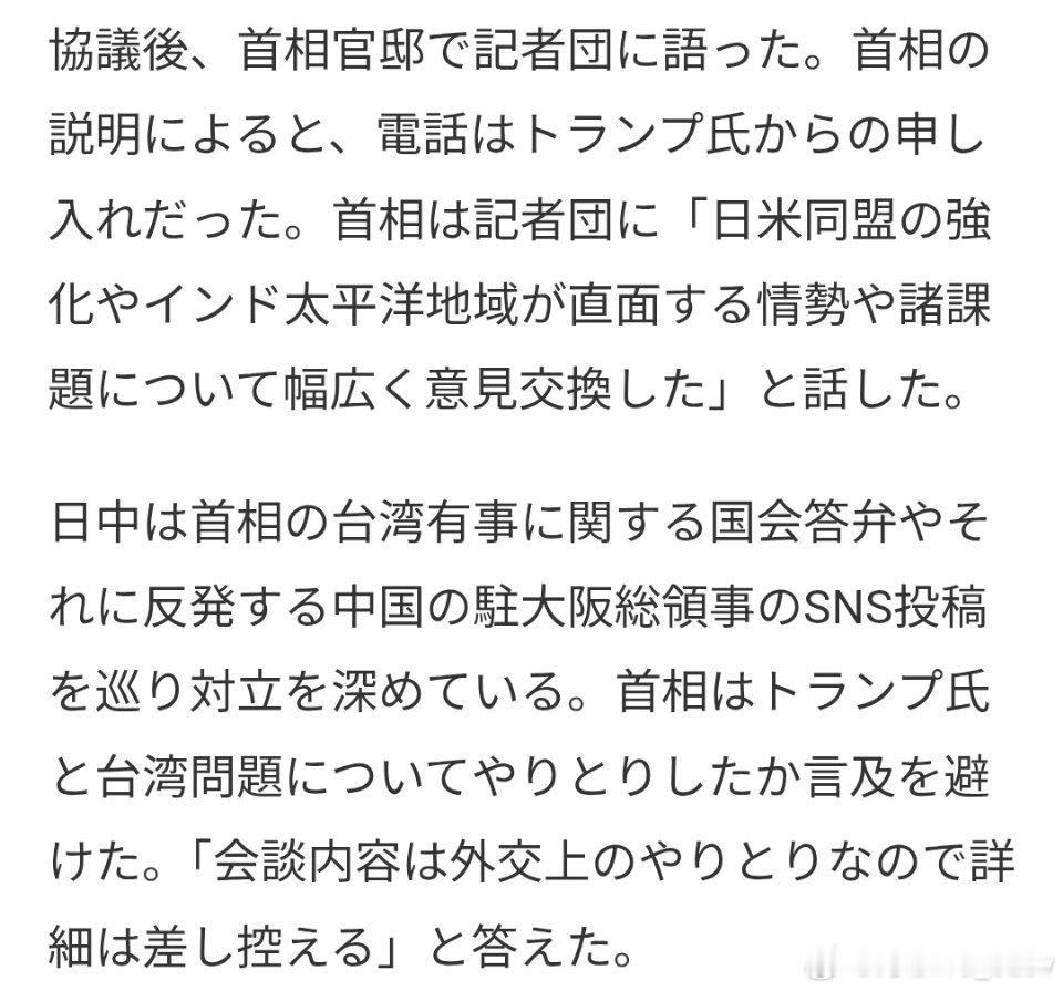 日媒刚刚消息:高市早苗确认已经与特朗普通了电话。高市早苗在回答记者提问时声称“与特朗普再次确认了日美之间紧密的合作关系,特朗普也表示和我是非常亲密的朋友,随时欢迎我给他打电话”。但是否与特朗普讨论过台湾问题的提问,高市早苗仅回应称:“这是外交方面的事项,因此不便透露细节”