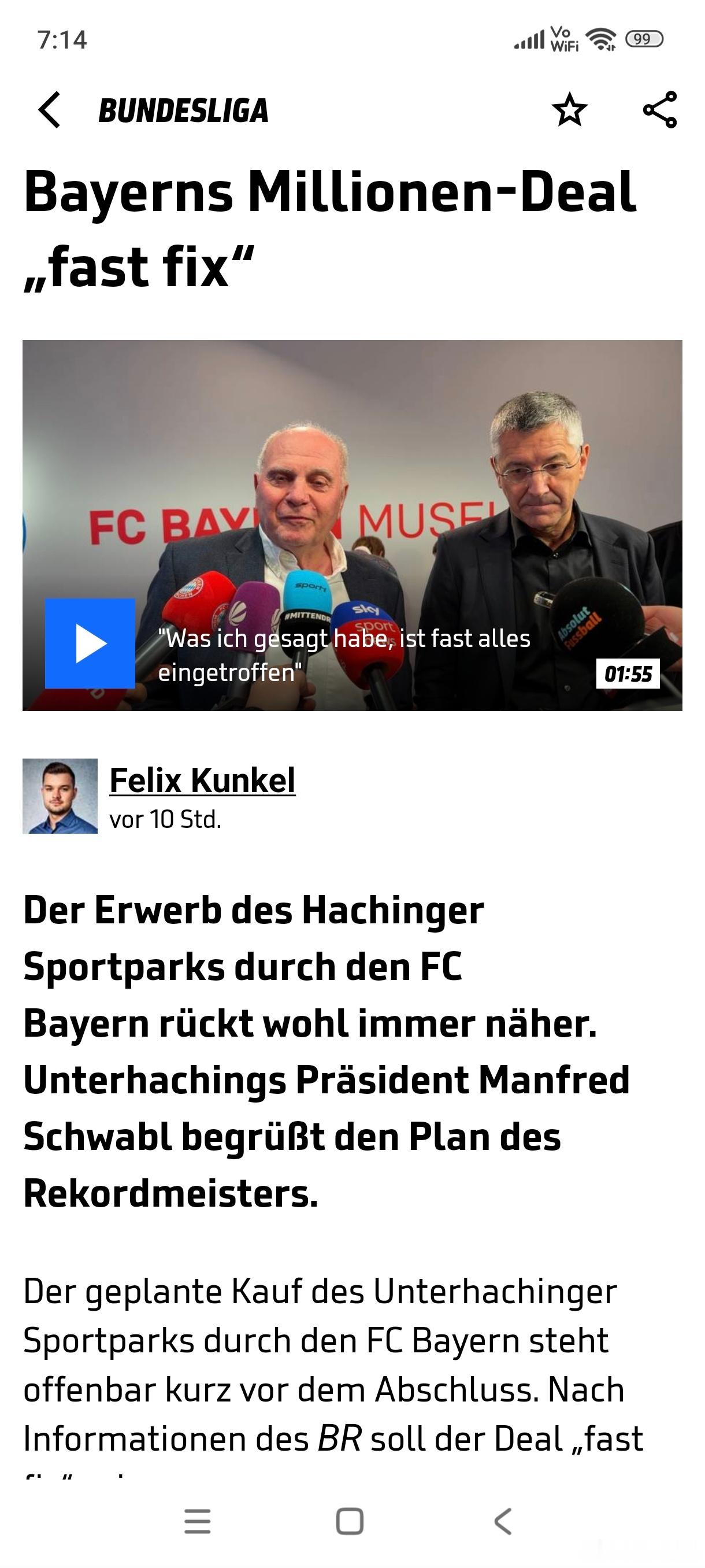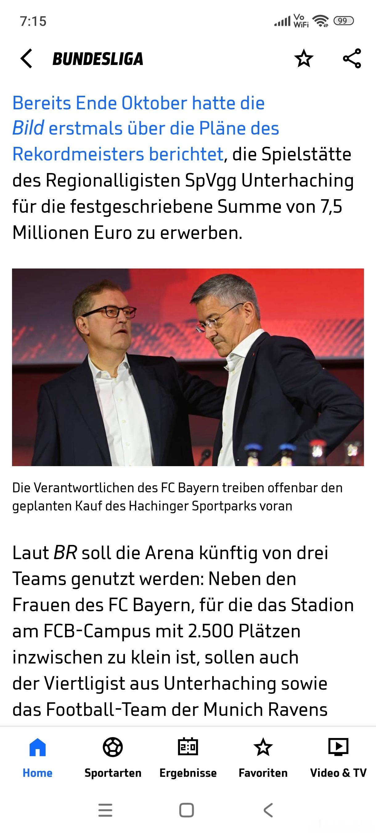 [拜仁接近买下翁特哈兴球场]巴伐利亚电台报道,拜仁已经非常接近买下翁特哈性兴球场产权,该球场目前归当地政府所有,正在寻求出售。由于拜仁青训中心的小球场对于拜仁女队来说太小了,所以拜仁打算今后将女队的比赛安排在这里(15000座位)。目前在第三级联赛挣扎的翁特哈兴俱乐部高层对此表示欢迎。该球场经历的最为著名的比赛是2000年5月20日,翁特哈兴在德甲最后一轮2:0阻击原本德甲榜首勒沃库森,帮助拜仁实现最后一轮翻盘夺冠,当时德甲的冠军奖盘被直接从这个球场送去了30公里外的慕尼黑奥林匹亚球场。[努力]