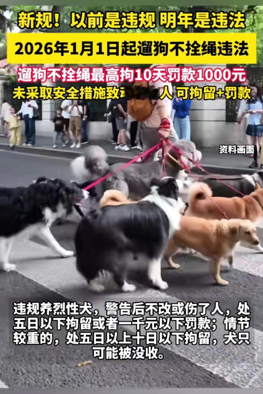 遛狗不栓绳,以前属于违规行为,今后则构成违法了。自2026年1月1日起,新增的《治安管理处罚法》开始施行。 若遛狗不拴绳导致狗伤人,狗主人可被拘留5到10天,最高罚款1000元。 违规饲养烈性犬,经警告后仍不改正或致使他人受伤的,处5日以下拘留或者1000元以下罚款。情节较重的,处5日到10日拘留,狗还有可能被没收。 我支持这样的规定,许多养狗人遛狗时不自觉拴绳、不约束自家狗的行为,从而引发了网上一系列的口水战。 有了这项法律规定,怕狗的人有了依仗,狗主人再也无法找借口推卸责任。 养狗人应当承担起责任,遛狗时拴好狗绳,这是每个养狗人应尽的义务。 拴好遛狗绳吧,不给别人带去苦恼,也不给自己找麻烦事。 养狗从不是一时兴起的消遣,而是风雨无阻的坚守。既然给了狗一个家,就要对它的生命负责,这才是养宠人最该有的担当。 来源:宁波晚报