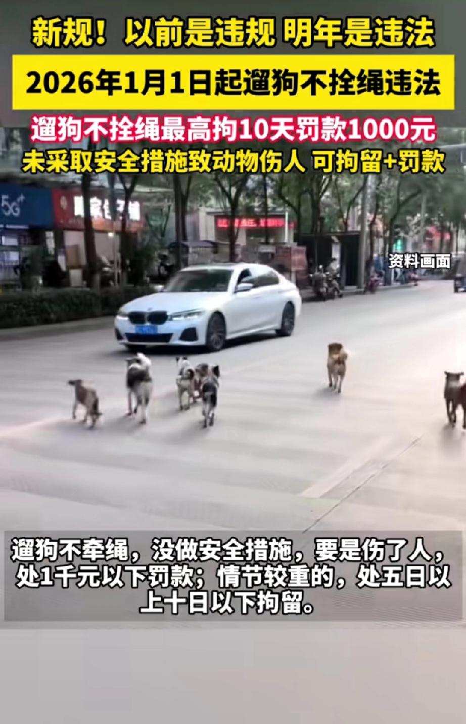 遛狗不栓绳,以前属于违规行为,今后则构成违法了。自2026年1月1日起,新增的《