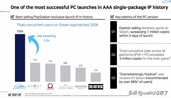 Shift Up发布了一组全新信息图,展示了《剑星》发行后的亮眼战绩。数据显示,《剑星》在Steam平台的首发当日峰值在线玩家数达19.2万人,这一数字是《对马岛之魂》的两倍多(7.7万人)。 信息图中还强调,《剑星》已成为“PlayStation独占单机游戏中PC平台首发销量最高的作品”,超过了《对马岛之魂》《战神》及《漫威蜘蛛侠》等大作。 此前,在当时的索尼互娱总裁吉田修平的极力建议下,《剑星》先行登陆PS5征服了主机玩家。随后,它又在PC平台复刻了这一成功。目前该作的PS5和PC平台总销量已突破300万份。