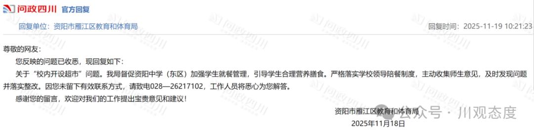 【资阳一中学校内超市被指影响学生健康,教体局:督促整改】近日,有家长在“问政四川”网络平台反映,资阳中学(东区)校内开设超市,影响学生正常就餐及身心健康。该校作为一所寄宿制学校,学生在校饮食主要通过预付费饭卡消费,但家长指出,校内超市的存在导致学生以零食代替正餐,不利于青少年健康成长。 据家长介绍,学生正餐消费减少,大量资金流向超市零食,可能影响身体发育与健康价值观的形成。家长同时提及,国家卫健委2021年印发的《营养与健康学校建设指南》中明确规定,不得在校内设置小卖部、超市等食品经营场所,不得售卖高盐、高糖及高脂食品和酒精饮料。近年来,多个省份也陆续出台类似规定,要求中小学、幼儿园逐步取消校内商超。在此背景下,家长对新办学校仍开设超市表示不解,呼吁相关部门予以重视。 此外,家长还反映了学校餐费调整问题。该校餐费由最初的10.5元/餐,陆续调整为12.5元/餐和15元/餐。家长质疑餐费定价是否经过科学论证与公开公示,并指出资阳市整体消费水平是否支持如此定价也存疑。 11月19日,资阳市雁江区教育和体育局回应: 关于“校内开设超市”问题。我局督促资阳中学(东区)加强学生就餐管理,引导学生合理营养膳食。严格落实学校领导陪餐制度,主动收集师生意见,及时发现问题并落实整改。