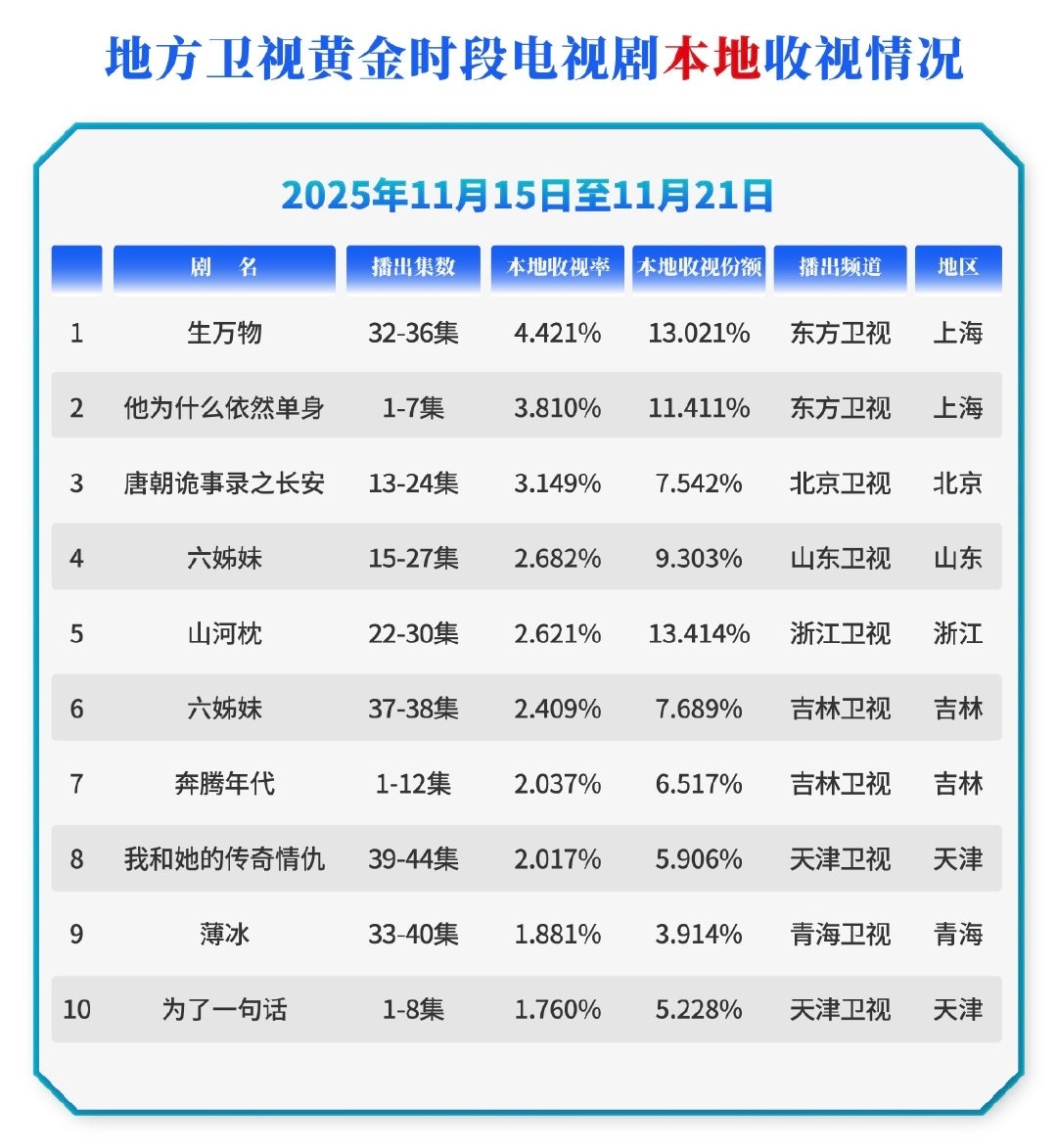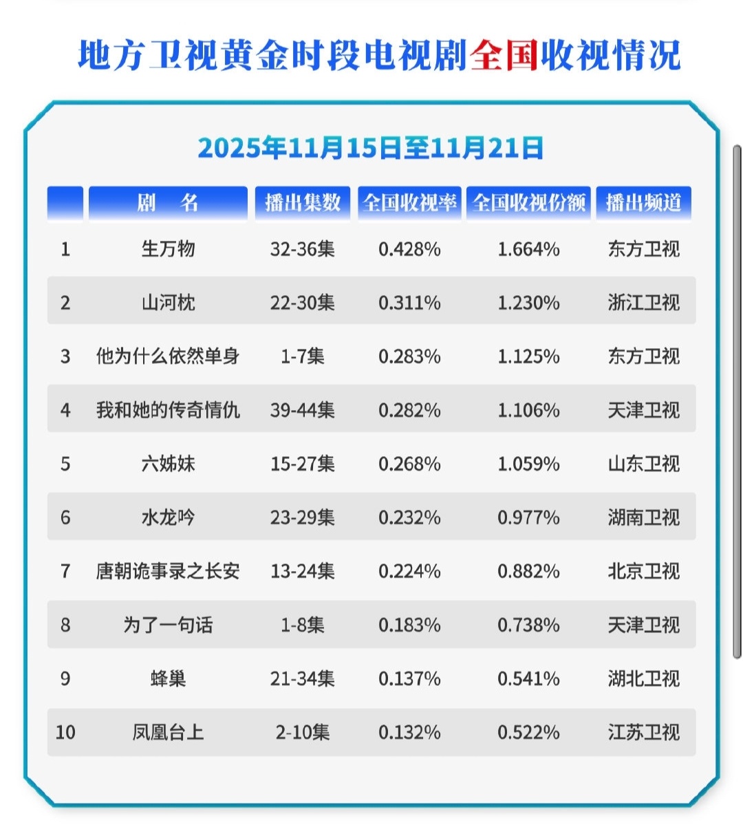 卫视11.15-11.21日cvb收视排名情况: 不是第一就是第二,对上星剧来说这收视情况真的非常不错了,对浙江卫视来说整个2025年山河枕的收视也是前三的水平!别的咱不提,有些人的一番上星cvb数据能和宋茜一样有两部破一以及连续七年上星了再来碰瓷。一番女主实打实的数据,氵的各种数据拿出来拉表碰瓷我只觉得可笑,一群没见过世面的