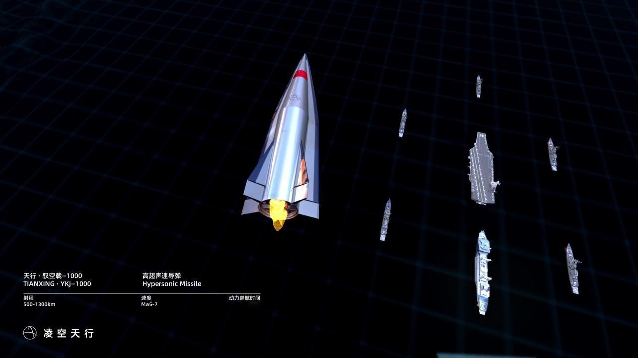 “凌空天行”重磅发布“驭空戟﹣1000”高超声速导弹,以5马赫以上极速重塑战场打击规则。采用先进乘波体气动构型与双模态超燃冲压发动机,可在临近空间实现“打水漂”式滑翔机动,横向机动范围超1500公里,现有反导系统难以预判轨迹。 导弹射程覆盖1000-1500公里,末端突防速度达10马赫,10分钟内即可精准打击战略纵深及海空高价值目标。搭载北斗+惯性+主动雷达多模制导系统,圆概率误差≤5米,核常兼备战斗部可高效毁伤航母、指挥中心等关键节点。 片中展示了模拟打击航母编队和日本的画面。