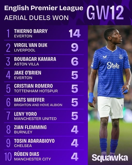 数据统计显示,巴里在本场比赛共计完成了14次成功争顶,这也是本赛季英超单场最多。作为对比,本轮英超联赛成功争顶第二多的范戴克也仅有9次。