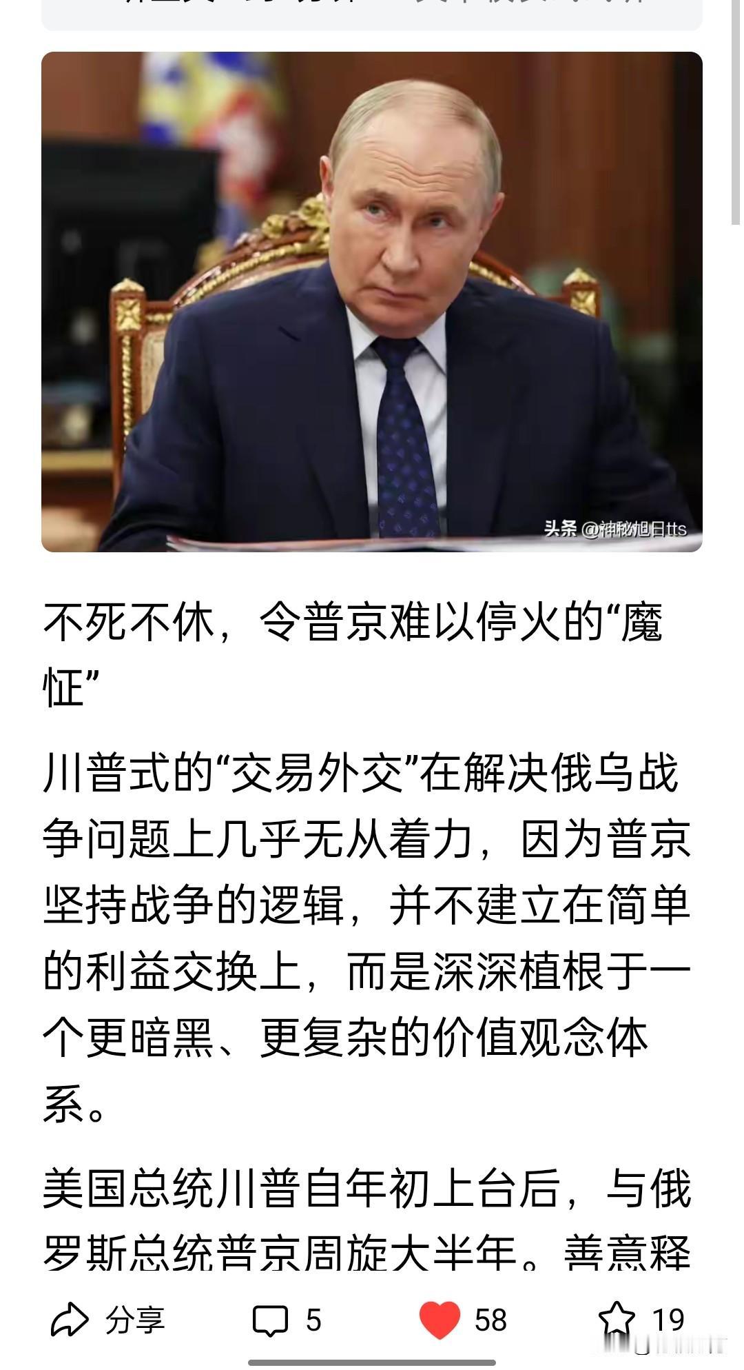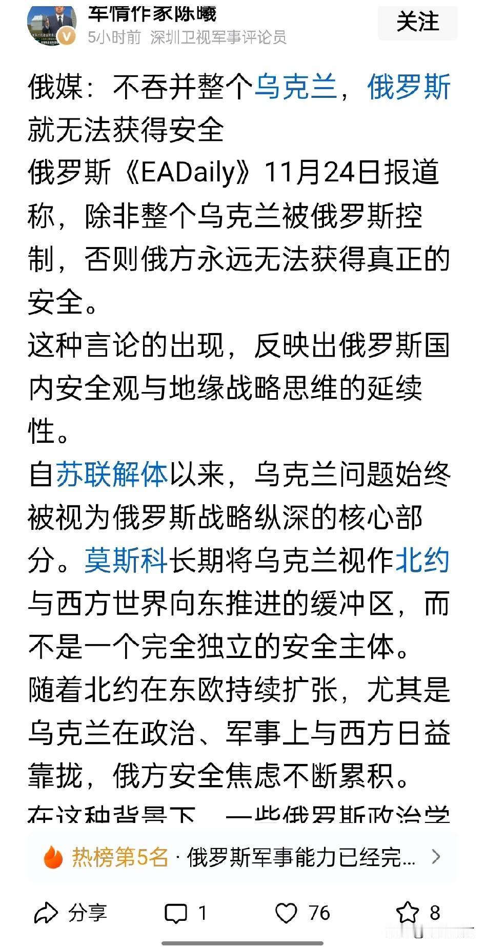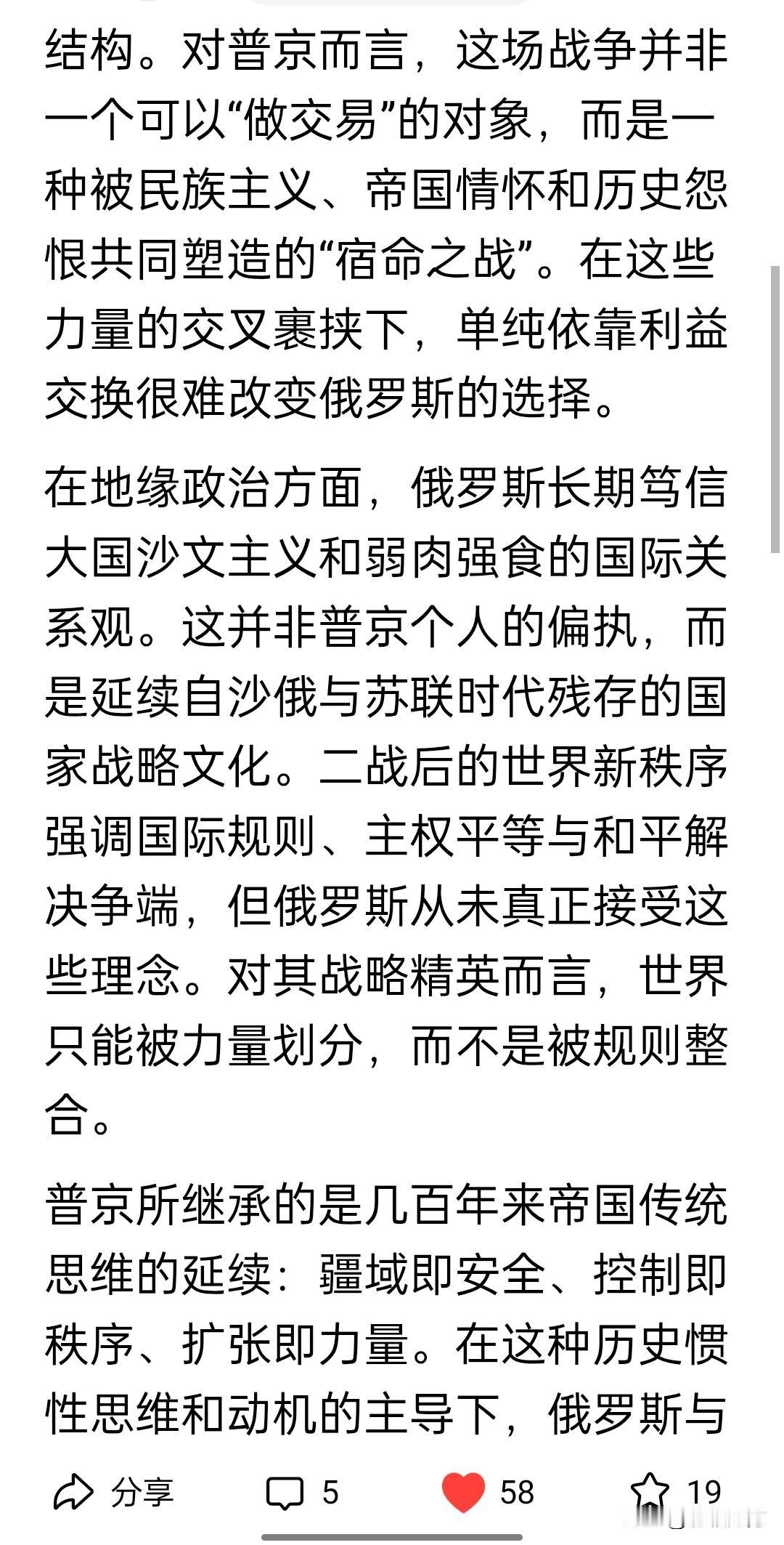 今天看到两篇介绍俄罗斯的文章,一篇引用大俄媒体的观点,认为俄罗斯只有完全控制乌克兰才会有真正的安全。另一篇文章则认为俄乌战争是普京不死不休的魔症。如果上述说法成立,那就相当于现实社会里的一个患有严重迫害妄想症的武疯子,随时可能因为感觉不安全而伤害他人。如果说控制乌克兰就会有安全感,那苏俄时代的四处扩张又代表什么?说白了就是个借口罢了。只要他们觉得有了足够的武力值,他们就会不断尝试掌控他人的命运,至于所要付出的代价,只要不危及他们自己,他们是不会在乎的。对于“魔症”了的武疯子,最好的办法当然是由警察一枪击毙,但国际上的那个警察好象也有些变质了。[捂脸]