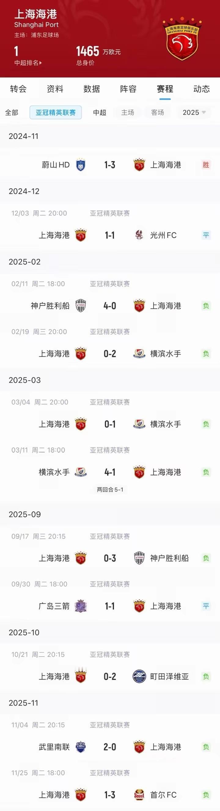海港亚冠已经10轮不胜!可谓东亚送分球队!我们看到这是海港近10场亚冠比赛!竟然输了8场!不少都是惨败!再看国内,海港上赛季双冠王,本赛季又是中超冠军!结果亚冠一胜难求!是海港没有认真踢?还是中超联赛真的水平低了?目前最大问题是下赛季亚冠海港还是要参加!