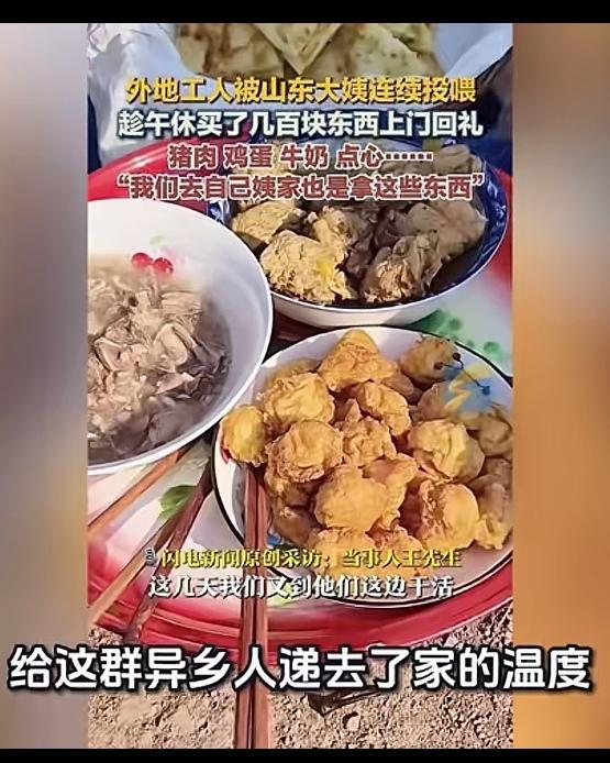 这世上最打动人心的,从来不是聚光灯下的豪言壮语,而是深山里一碗冒着热气的寻常饭菜。 11月8号,五莲县的天气已经转凉山野间的风带着寒意。12位来自河南的工人第一次踏上这片土地,他们的任务是安装风电设备,为这里带来清洁能源。 当12名河南工友第一次接过王大妈递来的热粥时,他们手足无措地蹲在路边吃完,生怕弄脏了这份好意。而几天后,他们已经能自然地坐在大妈家院子里,像回到自己家一样添饭夹菜。 没有谁刻意煽情,真情却早已漫出碗沿。 --- 王大妈今年六十多岁,看着工人们每天啃干粮、喝凉水,她默默生起了灶火。一锅小米粥,几笼刚蒸的馒头,自家腌的咸菜——她只是做了天下母亲都会做的事。 工人们过意不去,偷偷把200元钱压在碗底。王大妈发现后急了,挨个问遍工地才把钱退回:“出门在外不容易,我怎么能要你们的钱?” 你把我当孩子疼,我把你当亲人敬。 这群朴实的汉子不再坚持给钱,却用最笨拙的方式回报——每天收工后,主动帮大妈挑水、劈柴、修整院子。 --- 这哪里是一顿饭的事?这是在陌生人社会里,突然照进来的一束光。 在这个快递都不愿送上楼的年代,多少人已经忘了邻里间借米借油的温情。我们习惯了“不打扰”的边界感,却也失去了“远亲不如近邻”的亲密。 王大妈的灶台,烧热的不只是饭菜,更是我们内心那个渴望连接、渴望温情的角落。 --- 有网友说得真切:“破防了,想起我妈妈也会给楼下建筑工人送热水。” 原来,让我们泪流满面的,不只是一个大妈和12个工人的故事,而是那份被唤醒的集体记忆——人与人之间最本真的关怀,可以如此简单,又如此珍贵。 在这个寒冬,这场跨越山东与河南的“母子局”,这场毫无血缘的“亲情”,不正是我们最渴望看到的人间烟火吗? 善良遇见感恩,便是这世间最温柔的相逢。 你在外面,也一定被陌生人温暖过吧?欢迎在评论区分享你的故事。山东 感恩