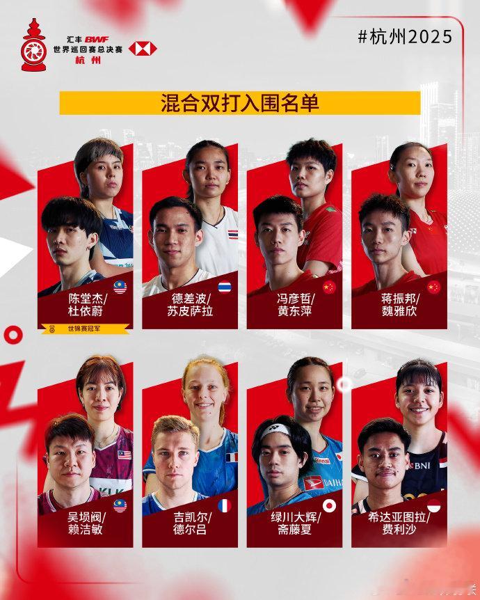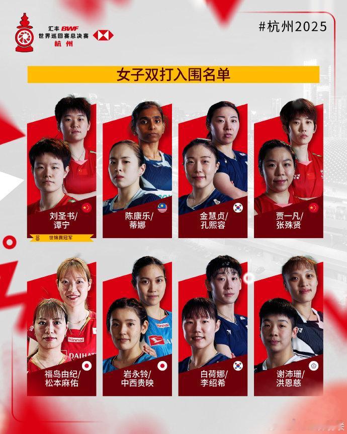 公布2025年世界羽联年终总决赛入围名单,中国队名单:【男单】石宇奇、李诗沣【女单】王祉怡、韩悦【男双】梁伟铿/王昶【女双】刘圣书/谭宁、贾一凡/张殊贤【混双】冯彦哲/黄东萍、蒋振邦/魏雅欣