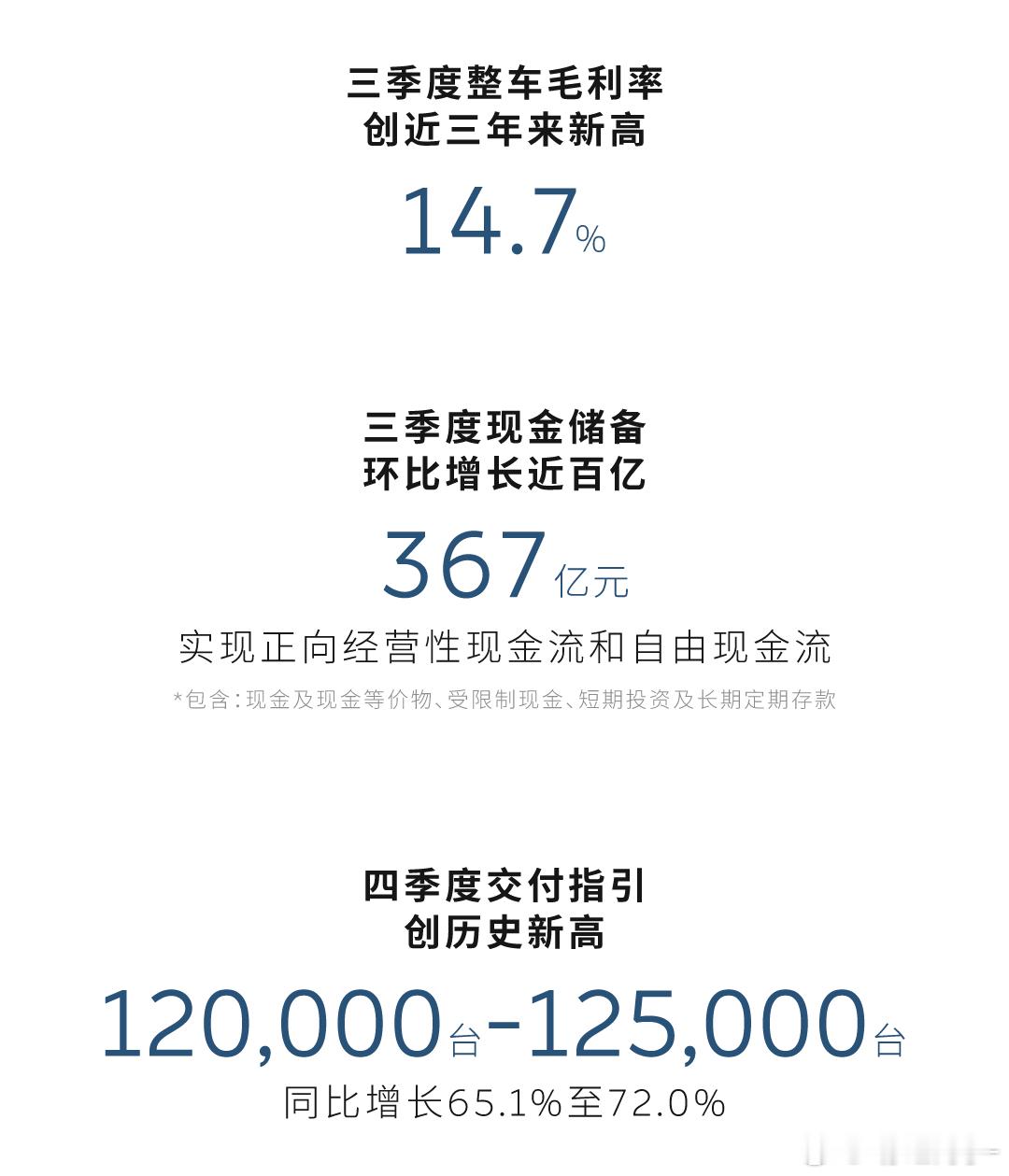 蔚来刚发布的2025年第三季度财报真心亮眼三季度交付87071台,同比猛增40.8%,营收冲上217.9亿元,双双创下历史新高。更关键的是整车毛利率拉到14.7%,综合毛利率13.9%,都是近三年最高点。现金流也争气,不仅经营和自由现金流转正,储备现金还涨到367亿元,比上季度多出近100个小目标。展望四季度,蔚来直接给出12万-12.5万台的交付指引,同比预增65%以上,营收瞄准327亿-340亿元。看来李斌说的“四季度必须盈利”真有戏