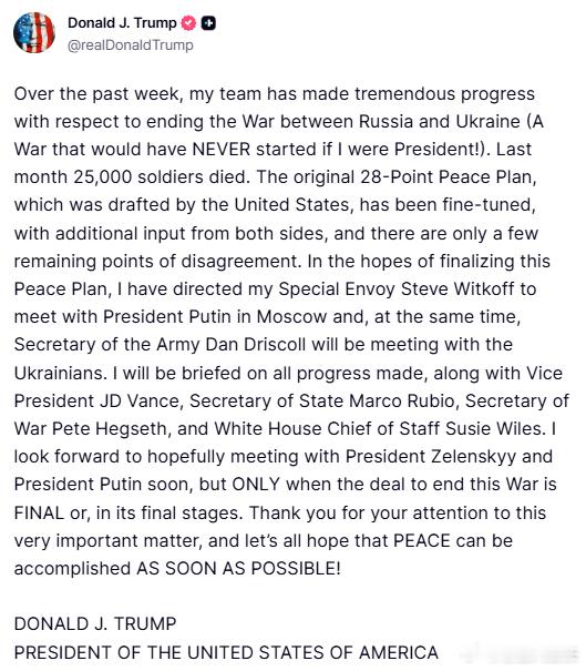 在过去的一周里,我的团队在结束俄乌战争方面取得了巨大进展(这场战争如果我还是总统,就绝不会爆发!)。上个月有25,000名士兵丧生。由美国起草的原始28点和平计划,在吸收双方意见后已进一步细化,目前仅剩下少数分歧点。 为争取敲定该和平计划,我已派特使史蒂夫·威特科夫前往莫斯科与普京总统会晤;同时,陆军部长丹·德里斯科尔将与乌方会面。我将与副总统JD·万斯、国务卿马尔科·鲁比奥、战争部长皮特·赫格塞斯以及白宫办公厅主任苏茜·怀尔斯一起听取所有进展汇报。 我期待在不久的将来与泽连斯基总统和普京总统会面,但只有在结束这场战争的协议达成或进入最后阶段时才会进行。感谢大家对这一极其重要事务的关注,让我们共同希望和平能够尽快实现! 唐纳德·J·特朗普 美利坚合众国总统