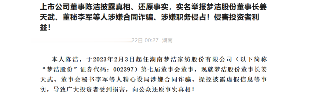据媒体报道,11月22日,自称为梦洁股份董事陈洁的人士撰写的一篇举报文章在网上流传,文章称梦洁股份董事长姜天武、董秘李军等人涉嫌合同诈骗、涉嫌职务侵占、侵害投资者利益。举报文章长达1.3万字,并晒出多张照片和聊天记录。