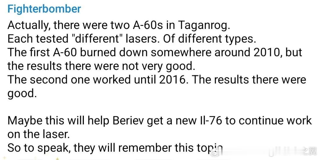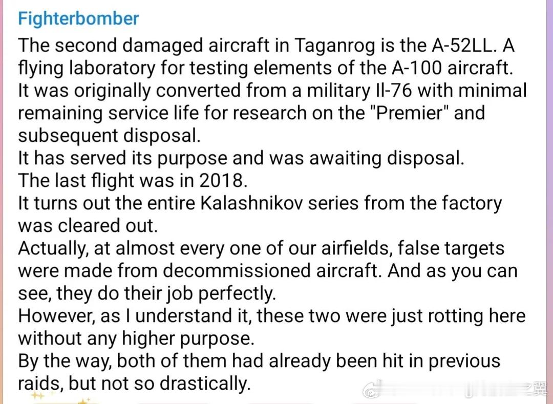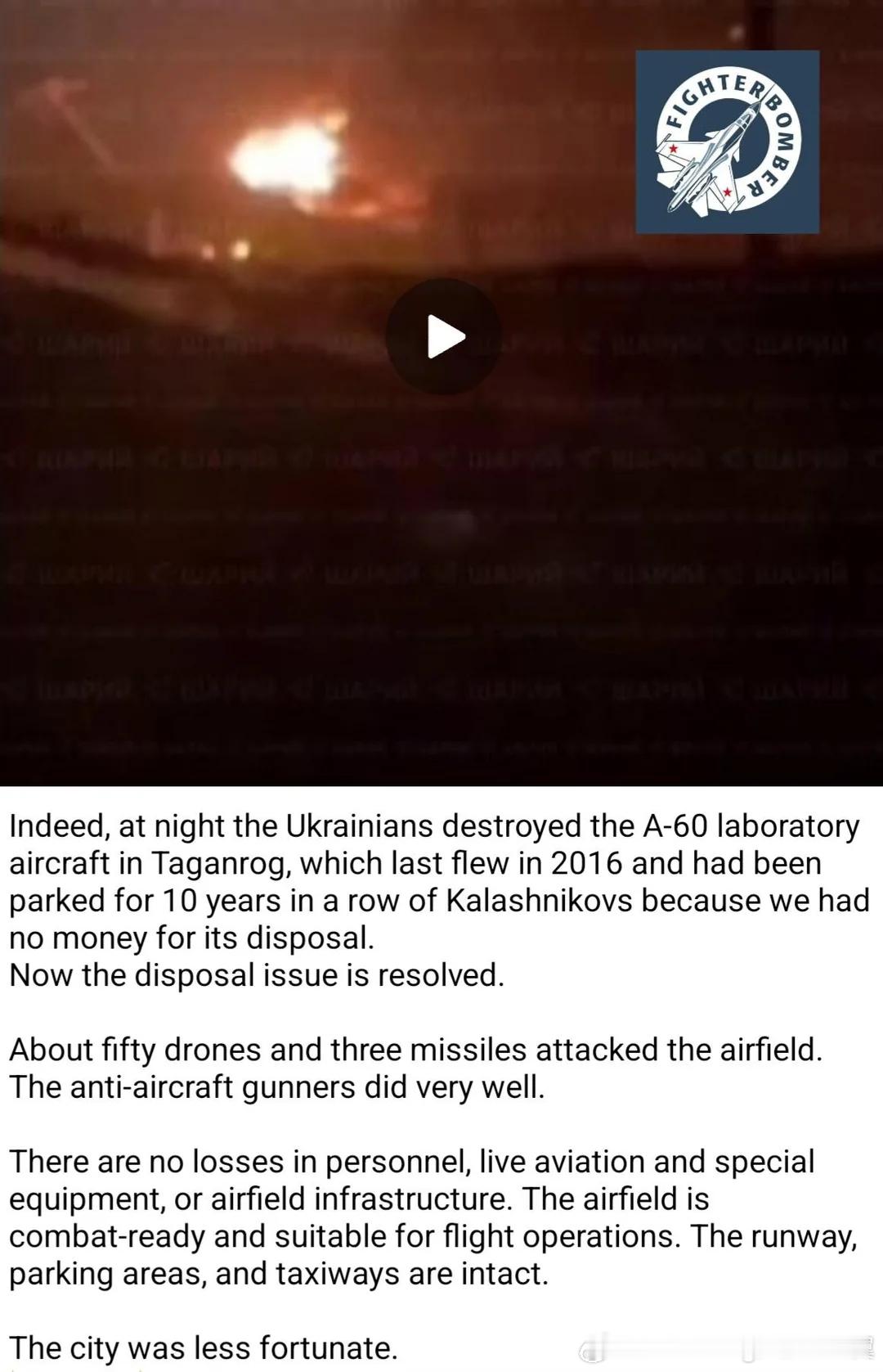 俄罗斯博主Fighterbomber谈塔甘罗格被摧毁的A-60机载激光炮,该机在2016年停飞。此外还有一架A-52LL预警机测试机被毁。他指出,机场基础设施没有损失或损坏,仍然处于战备状态。