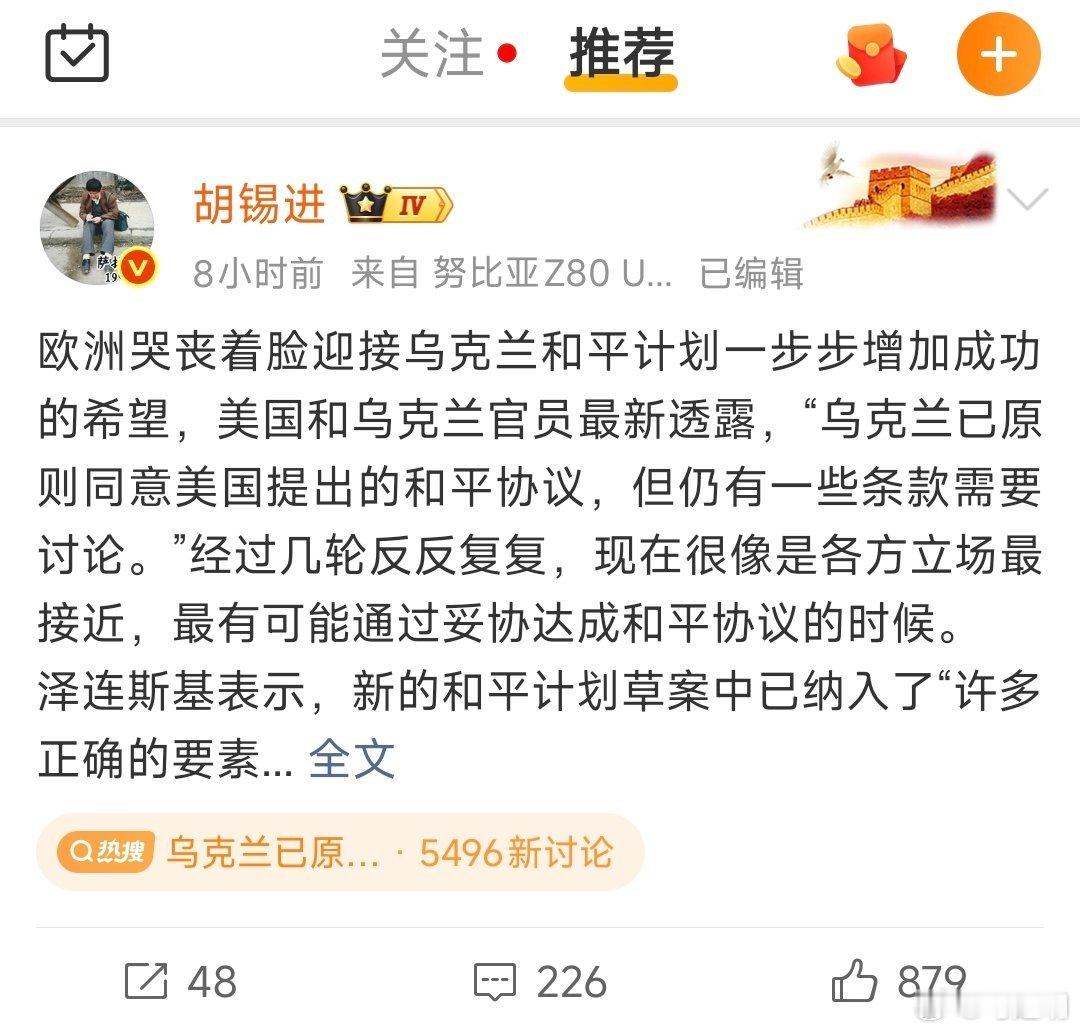胡锡进老师说,“欧洲哭丧着脸迎接乌克兰和平计划一步步增加成功的希望……”那欧洲是不是应该敲锣打鼓庆祝?欧洲“哭丧”着脸,难道其他洲都发贺电了?老兄啊,既然去过萨拉热窝,就该知道战争对老百姓意味着什么。历史证明,欧洲哭丧着脸妥协的时候,“哭声”会蔓延到其他洲,想想张伯伦同志,哭丧着脸,喝了几杯慕尼黑啤酒,以为搞定了。结果呢?啤酒里有砒霜,让整个世界买单。这世界是一个大村子,就别看别人家哭的时候,好像自己赢了一样,更别干公公推腰的事儿,身爽是真爽,眼爽只会是失落。