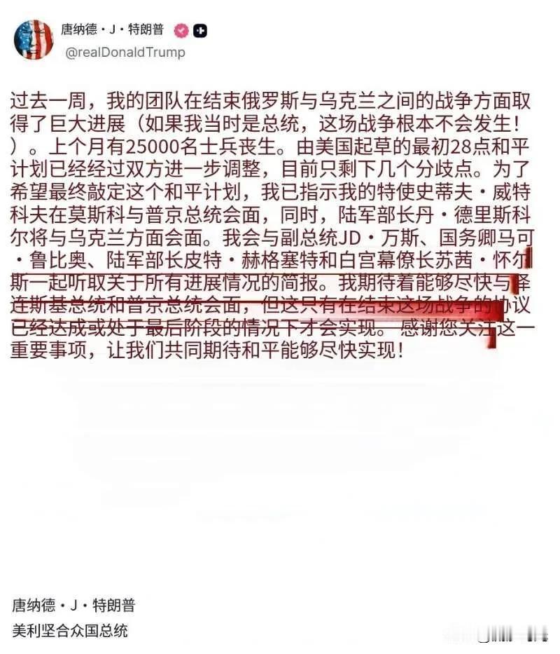 特朗普:过去一周,我的团队在结束俄罗斯与乌克兰之间的战争方面取得了巨大进展(如果我当时是总统,这场战争根本不会发生!)。上个月有25000名士兵丧生。由美国起草的最初28点和平计划已经经过双方进一步调整,目前只剩下几个分歧点。为了希望最终敲定这个和平计划,我已指示我的特使史蒂夫·威特科夫在莫斯科与普京总统会面,同时,陆军部长丹·德里斯科尔将与乌克兰方面会面。我会与副总统JD·万斯、国务卿马可·鲁比奥、陆军部长皮特·赫格塞特和白宫幕僚长苏茜·怀尔斯一起听取关于所有进展情况的简报。我期待着能够尽快与译连斯基总统和普京总统会面,但这只有在结束这场战争的协议已经达成或处干最后阶段的情况下才会实现。感谢您关江这一重要事项,让我们共同期待和平能够尽快实现! 唐纳德·J·特朗普美利坚合众国总统
