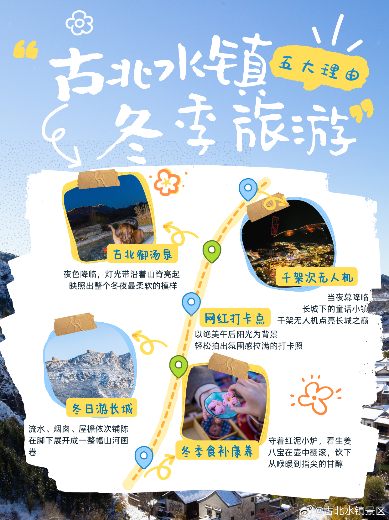 童话小镇的冬日情书:收集冬天的五种浪漫!冬天去哪儿❄️就去古北水镇厌倦了城市的雾气和冷风🌬️到长城脚下换一口清冽的冬日空气✨ 看千架无人机闪耀长城之巅🛁 泡温暖直抵心尖的冬日汤泉🍲 吃热气腾腾的冬日特色美食📸 拍网红打卡点的绝美出片照🏔 爬司马台长城纵览小镇全景做好五件事,这趟不白来🤩理由1️⃣:看千架无人机闪耀长城之巅📅11月28-30日,仅限三天当夜幕降临长城下的童话小镇🏡千架无人机点亮长城之巅3D光影层层叠叠🌃画面铺满整个夜空走进一座星光闪烁的童话剧场✨理由2️⃣:泡温暖直抵心尖的冬日汤泉冬天动人的一幕💕就是在长城脚下泡一池热汤♨️夜色降临,灯光带沿着山脊亮起热雾升腾,映照出整个冬夜柔软的模样 ✨古北御汤泉✨焕新升级✅御道汤院(段家大院)山景庭院汤泉,山水间舒享清闲✅御舍汤泉(御舍精品酒店)看长城美景,泡暖身汤泉✅御大汤池(御大水世界)养生+娱乐,全家欢聚超尽兴✅十三妹女子主题度假酒店房间独享私汤,静谧私享时光理由3️⃣:吃热气腾腾的冬日特色美食御道汤院的围炉煮茶🍵是冬日不可或缺的暖胃仪式守着炭火小炉,看生姜八宝在壶中翻滚饮下从喉暖到指尖的甘醇炭火慢烤的板栗、南瓜甜糯拉丝🌰再配上酥香的中式糕点🥮脆香的干果与酸甜解腻的鲜果在茶香食暖,闲话家常中将暖意传递直达指尖♨️理由4️⃣:拍网红打卡点的绝美出片照网红大片直出地,锁定古北水镇·山顶教堂📍在观景露台俯瞰小镇与长城的壮阔全景再点一份精致下午茶以绝美午后阳光为背景☀️轻松拍出氛围感拉满的打卡照建议日落时分前往一次收获日暮与初上华灯两种美景理由5️⃣:爬司马台长城纵览小镇全景冬天登临司马台长城看到完全不一样的小镇山色褪去了浓绿和红叶只剩下远处起伏的山脊⛰️流水、烟囱、屋檐依次铺陈在脚下展开成一整幅山河画卷🖼️从无人机震撼夜空到汤泉温暖身心♨️从围炉茶暖到教堂大片📸再到独揽长城苍茫⛰️这个冬天,一键打包所有浪漫与震撼📦古北水镇,等你赴一场冬日之约!#古北水镇##司马台长城##古北御汤泉##长城下的童话小镇#