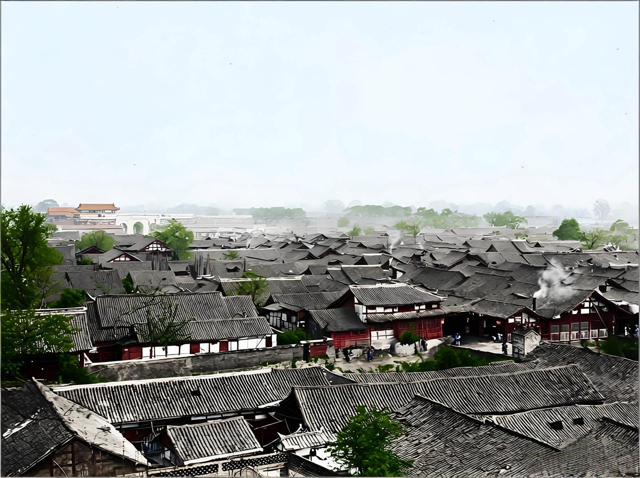 这是1904年成都城的鸟瞰景象(由美国地质学家张伯林拍摄记录),主体为川西传统民居,以一至两层穿斗木结构建筑为主,覆盖青瓦屋顶(屋顶坡度平缓,适配四川多雨气候)