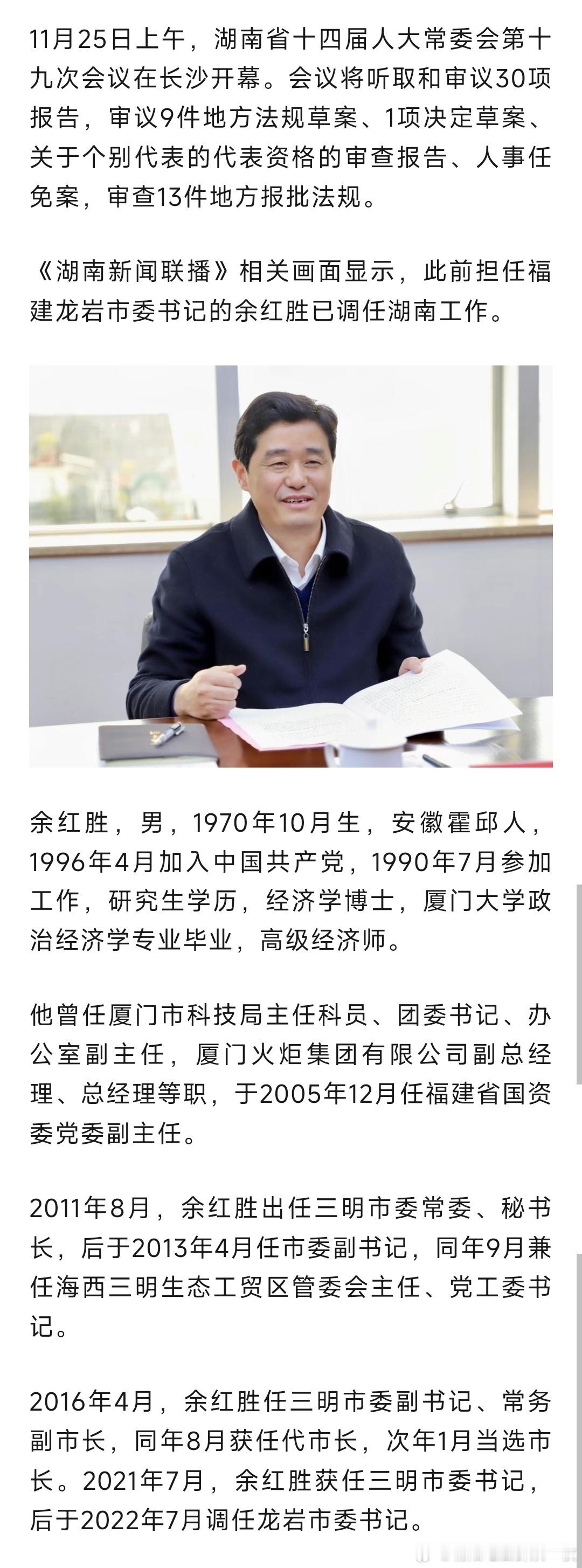 福建龙岩市委书记余红胜,已赴湖南工作。