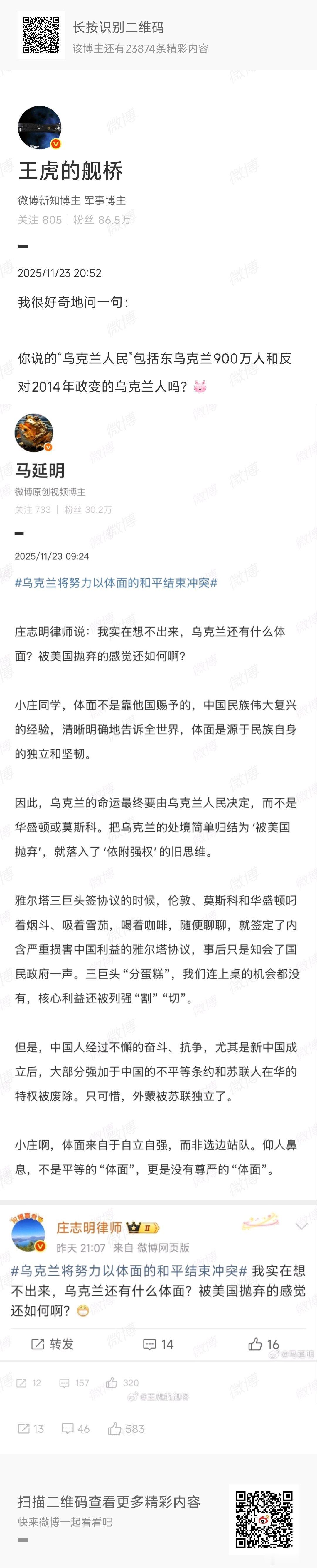 “王虎的舰桥”老师问“我很好奇地问一句:“你说的“乌克兰人民”包括东乌克兰900万人和反对2014年政变的乌克兰人吗?”兄弟啊,有些问题它对于一些人来说,的确是“超纲”了。有些事儿,即便我说明白了,那些没有知识、常识和逻辑支撑的人,他还会瞪着眼,梗着脖问“为什么?就说“人民”这个词儿吧,它有非常强烈的政治属性,国家代表人民,这是现代政治体制的基础,他是国家民主的基石。但是,“人民”不代表国家。你说三五个人观点一致,就以“人民”自居,还要代表国家搞分裂,这分明是在扯淡!小兄弟问“乌克兰人民”包括东乌克兰900万人和反对2014年政变的乌克兰人吗?”这答案还需要问吗?他们当然是乌克兰人民,但他们不能以“人民”的名义搞分裂,这是国际共识。他们搞分裂,对于乌克兰整个国家来说,他们就是敌人,是乌克兰人民的公敌。如果这帮俄裔人跟政府要自治权,他们还是人民,内部谈的事儿。但如果他们要将自治权扩大到主权,还要带着土地加入别的国家,这是分裂,他们这还是人民吗?归纳几句,“要自治,是家人,可以谈;要分裂,就是拆家的贼,必须打。”这个内容很复杂,也很简单。不知小兄弟,看明白了吗?