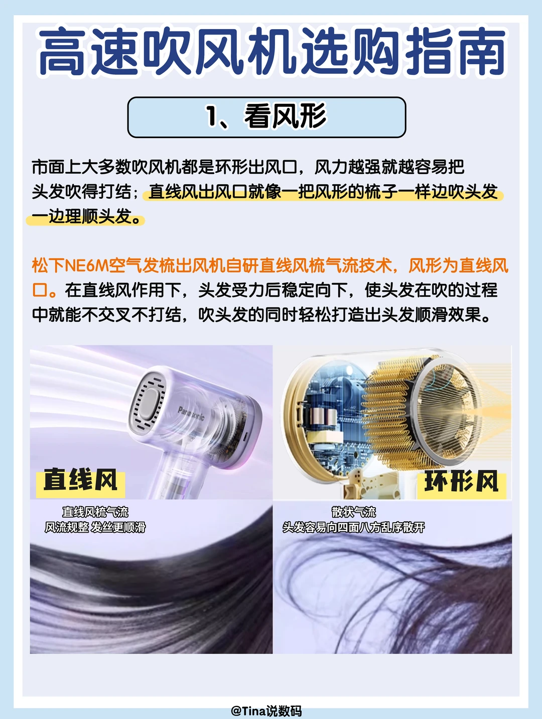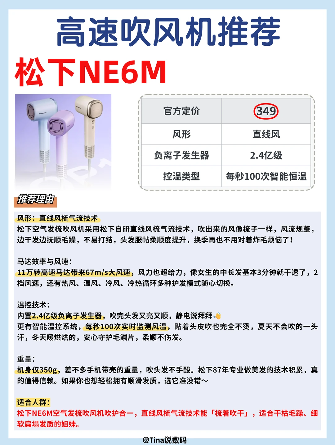 松下NE6M空气发梳吹风机吹护合一,直线风梳气流技术能「梳着吹干」,适合干枯毛躁、细软扁塌发质的姐妹。