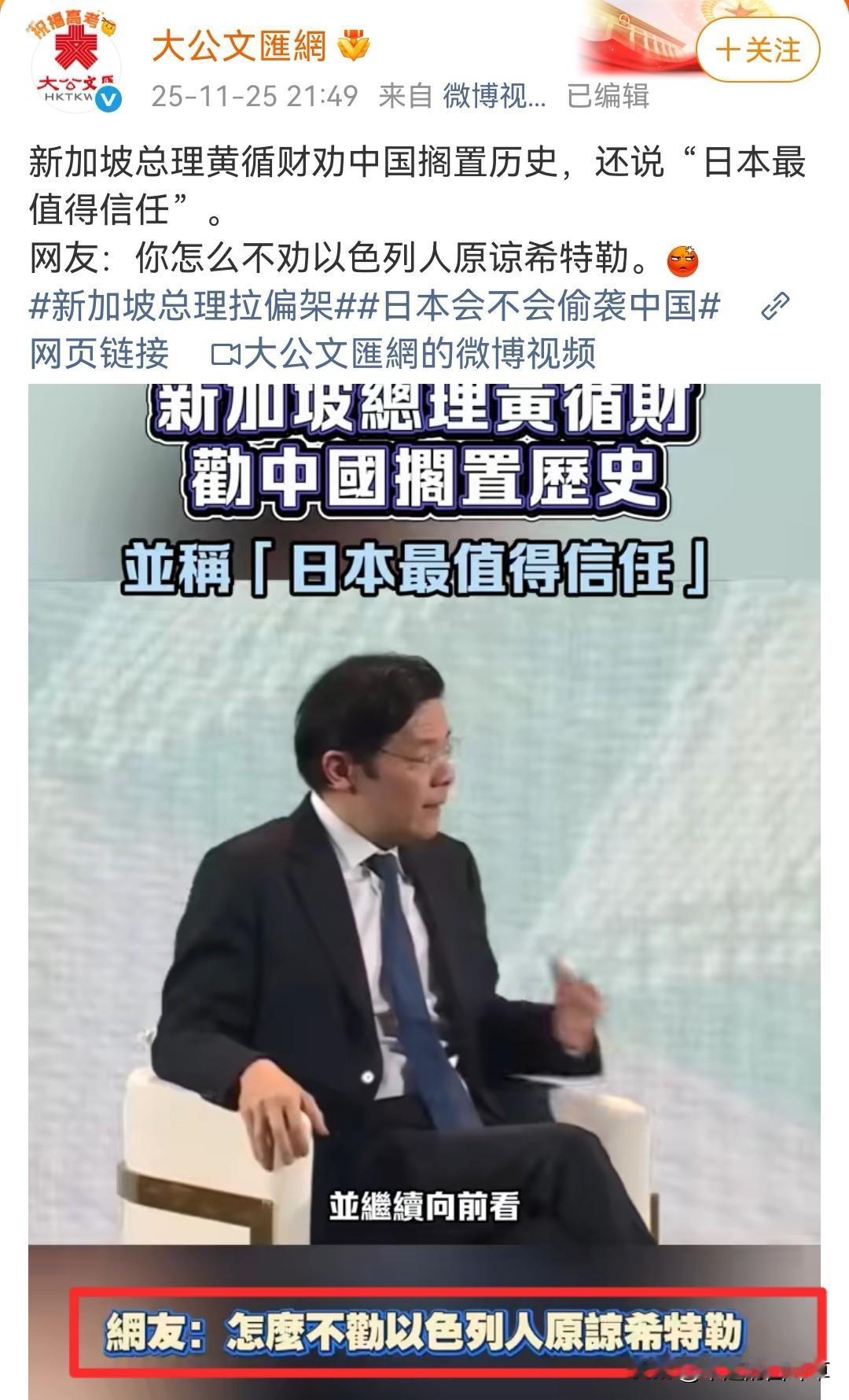 新加坡劝中国放下历史,我不奇怪 但谁能想到 自己被日本侵略过的国家 反过来劝受害者别记仇 香港报纸那话扎得准,咱心里想八百回的气 人家直接替咱喊出来了 有位网友说得好:你怎么不劝以色列人原谅希特勒 自己挨过刀的人劝别人别记仇 这道理哪说理去?