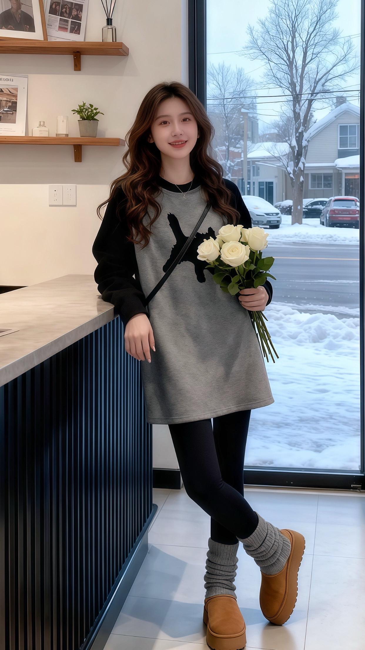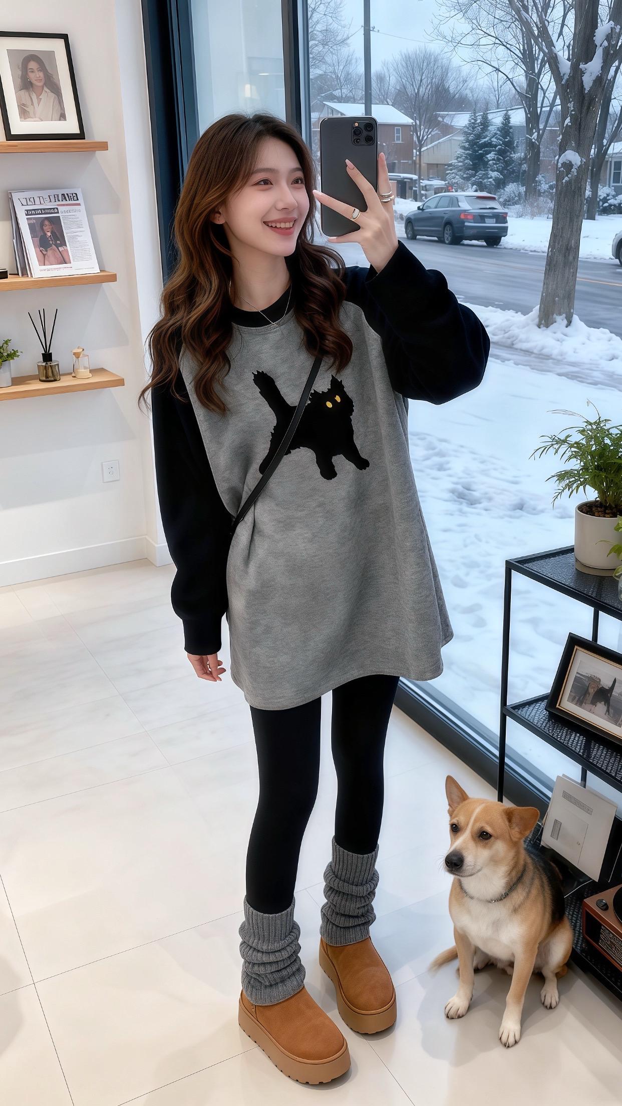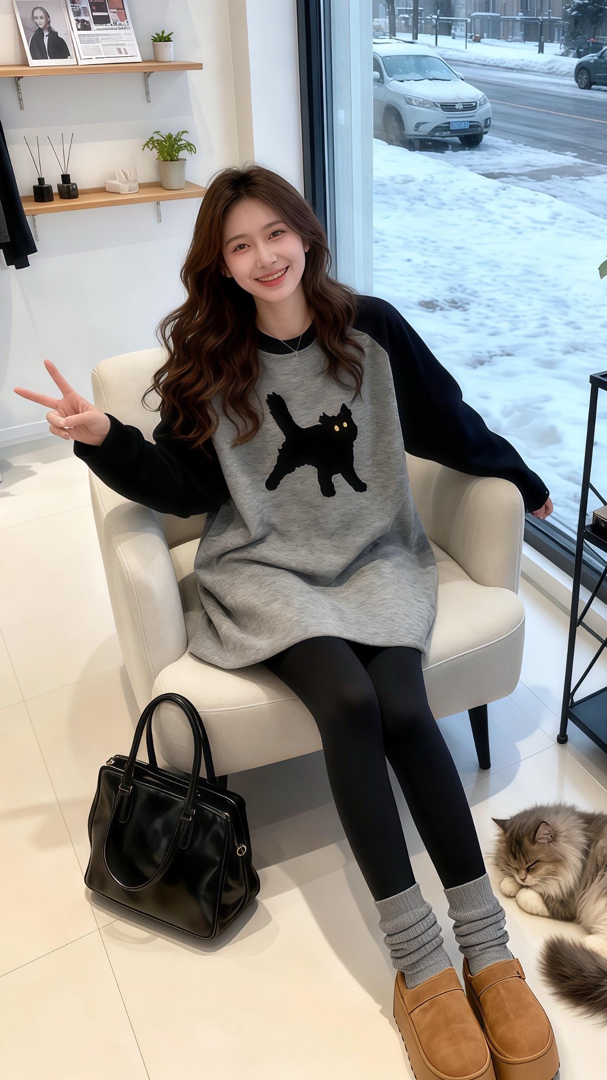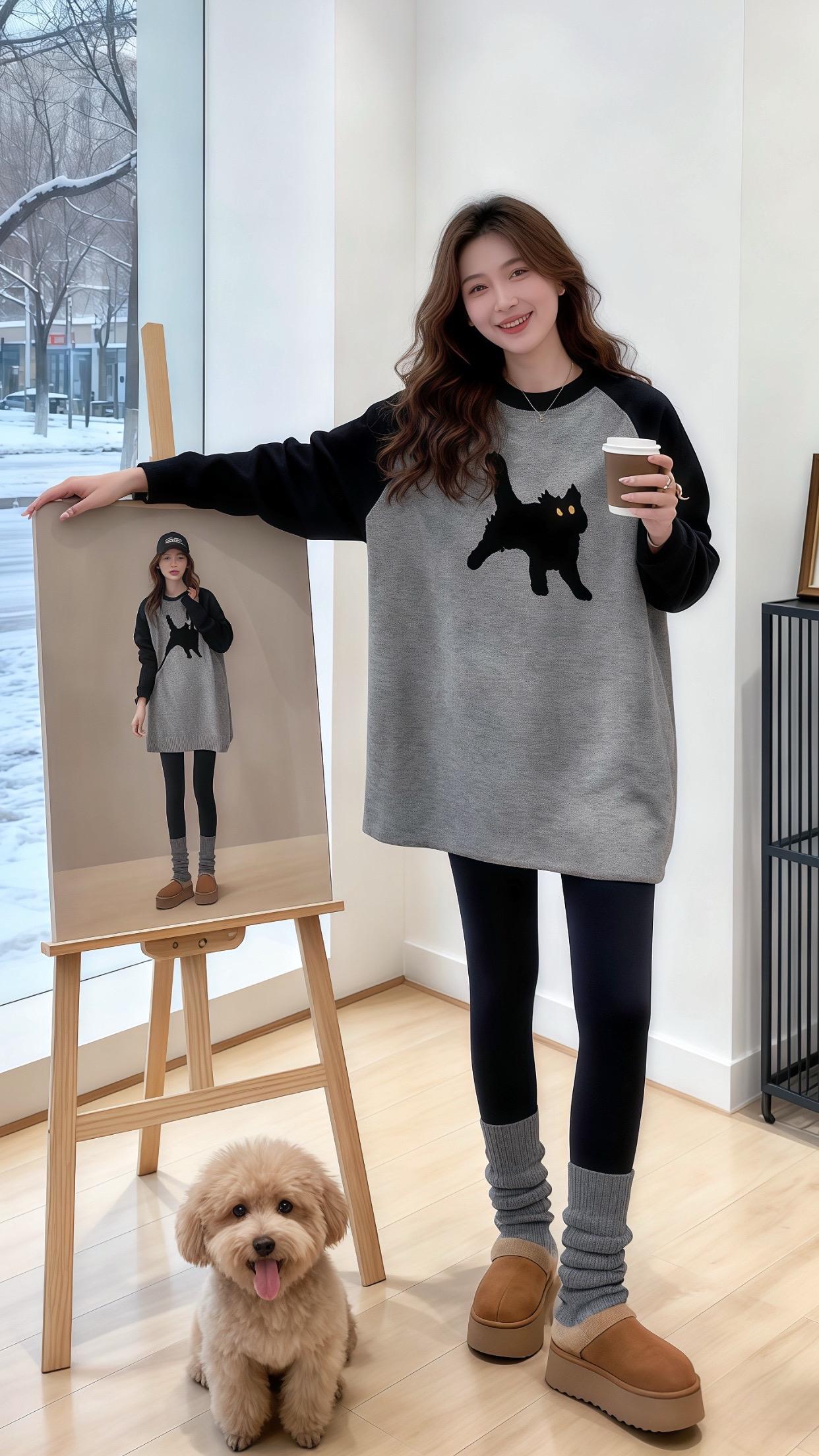 这身穿搭的灵魂就是这件灰黑撞色中长款上衣!看着是宽松T恤的随性版型,实则是暖乎乎的德绒厚实面料,裹在身上像抱了团软绒绒的云,深秋穿也能把凉意挡得死死的。胸前的黑猫图案透着灵动俏皮,插肩袖设计藏肉又衬得身形软软糯糯,长款版型刚好盖过胯,配黑色打底裤+堆堆袜+厚底靴,暖得轻盈还自带甜酷滤镜。 连小狗🐶都忍不住凑过来沾沾这份松弛感~保暖和颜值双在线,冬天内搭也超合适,出门不用纠结穿搭的快乐,这件上衣直接给满啦!