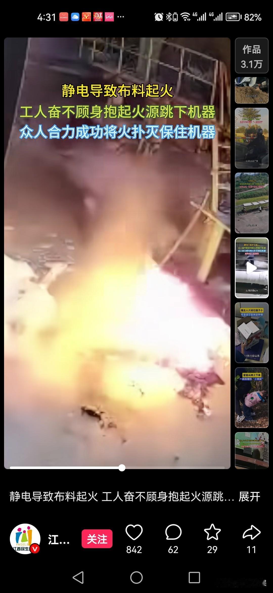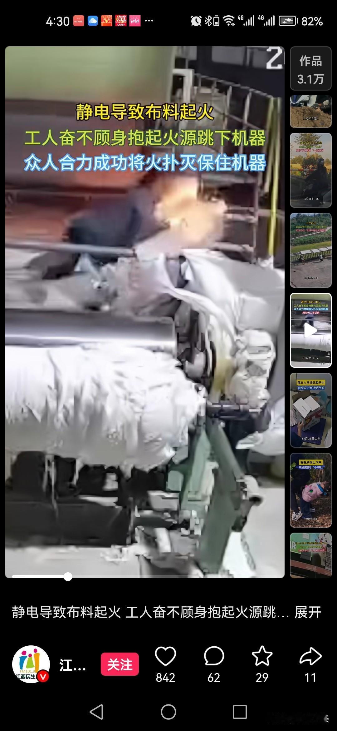 老板必须给这名员工奖励!一工厂内,机器上的布料由于静电起火了,一名工人竟然奋不顾身的跳上了机器,抱着着火的布料跳下机器,当时布料燃起的火势很大,情况很凶险,但是这名工人竟然毫不畏惧,抱着布料扔在地上,火势迅速蔓延,这时又来了几名工人,大家合力成功的降火扑灭,保住了机器。 有的网友说:老板高低应该奖励这个工人几万块吧! 也有的网友说:这个要是工人的话,那是必须无条件涨工资,提干,这样的奋不顾身的行为,必须要加奖。 还有的网友说:好样的!临危不乱,处理得当。必须嘉奖! 网友们都建议一定要嘉奖这名员工,当时如果没有这名员工,机器肯定不保了,这名员工不但挽救了工厂的损失,而且他一定是位爱厂如家的人,应该给予嘉奖鼓励!