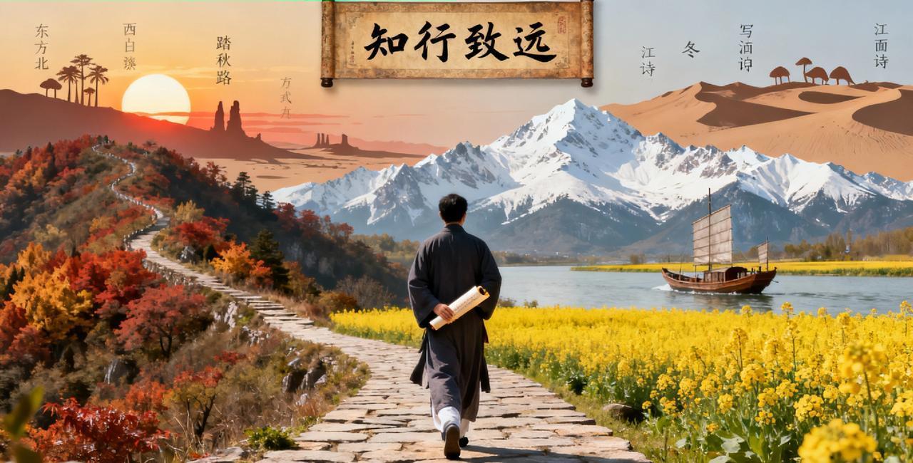 请你对下联踏春夏秋冬路,写东西南北诗。横批:知行致远 (“踏路”为行,“写诗”为知,藏四季山河里的修行与情怀)