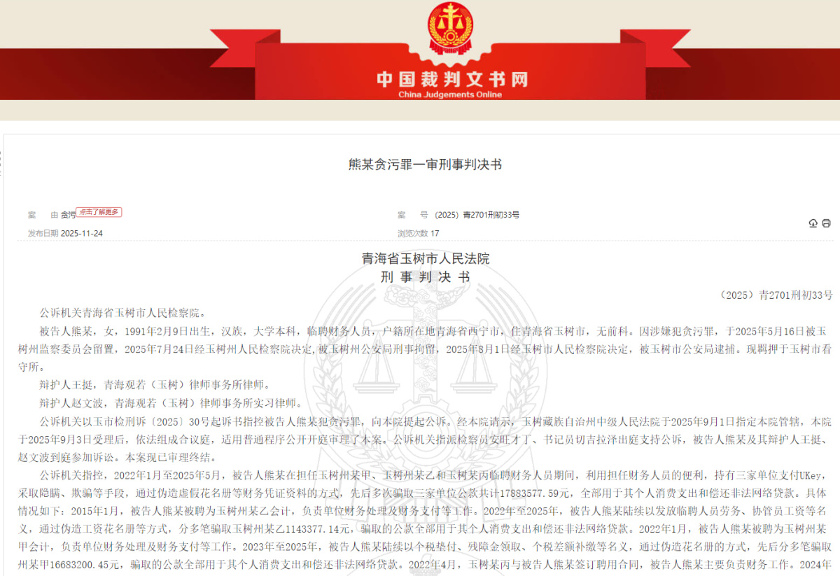 11月26日,大河报《看见》记者从中国裁判文书网获悉,青海省玉树市人民法院于11月24日公布了该案的刑事判决书,熊某犯贪污罪,判处有期徒刑十三年,并处罚金一百万元;依法追缴熊某违法所得17883577.59元。