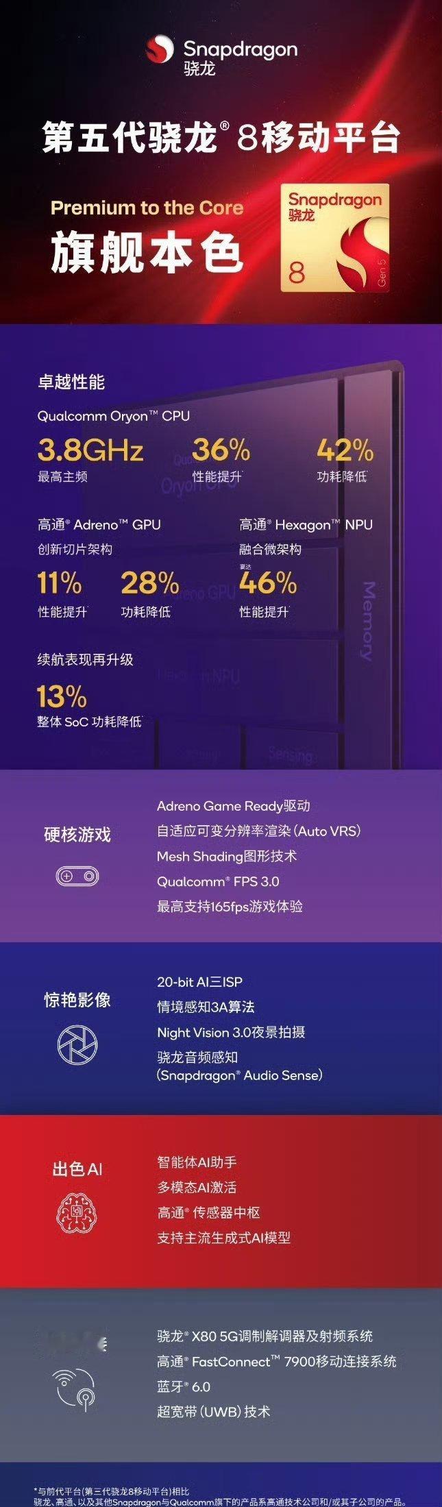 骁龙 8 Gen 5 处理器全部参数:SM8845,将由 12 月的一加 Ace 6T 首发,后续 vivo S50 Pro mini、iQOO、摩托罗拉、魅族的新机也会搭载这枚芯片。- 制程:台积电 3nm N3P,SoC 整体功耗最多降低 13%;- CPU:2×3.8GHz 超级内核 + 6×3.32GHz 性能内核,CPU 性能提升 36%,能效提升 42%,网页浏览响应速度提升 76%;- GPU:Adreno 840 GPU 1200MHz ,GPU 性能提升 11%,能效提升 28%;- 游戏表现:《原神》60fps 极高画质30 分钟平均帧率 60.39fps、《和平精英》120fps 流畅画质 30 分钟平均帧率 119.72fps、《三角洲行动》165fps 流畅画质 60 分钟平均帧率 164.34fps;- NPU:Hexagon NPU 性能提升 46%;- 调制解调器:骁龙 X80,支持 6 根接收天线,5G-Advanced,峰值下行速率 10Gbps,峰值上行速率 3.5 Gbps;- 移动连接系统:FastConnect 7900,6nm 制程,峰值速度 5.8Gbps,支持 Wi-Fi 7、蓝牙 6.0、UWB,相比 FastConnect 7800 节能 40%;- 内存/闪存:支持 4800MHz LPDDR5x 内存,UFS 4.1 闪存。第五代骁龙8一加ace6t