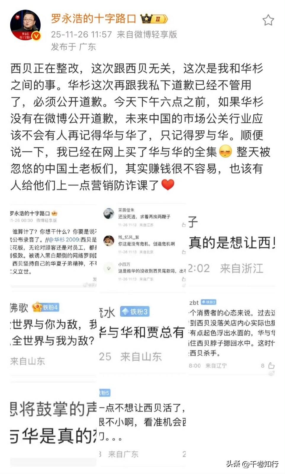 罗永浩这家伙,下午六点前逼华杉公开道歉,不然华与华公关公司就得改名叫罗与华,永世不忘。 结果呢,时间一到,人家华杉直接微博防护模式拉满,评论区瞬间变无人区,这反转,够味儿吧? 你想想,老罗明明想借这事儿刷一波存在感,华杉倒好,不跟你玩硬刚,等于一巴掌扇在空气上,啪的一声,全世界都听见了尴尬。 公关界这潭水,本来就够浑的,你非要搅和,结果自己溅一身泥。 话说,这俩人下回约战,还设不设截止时间了?不然,防护模式一开,热闹全没了。华与华