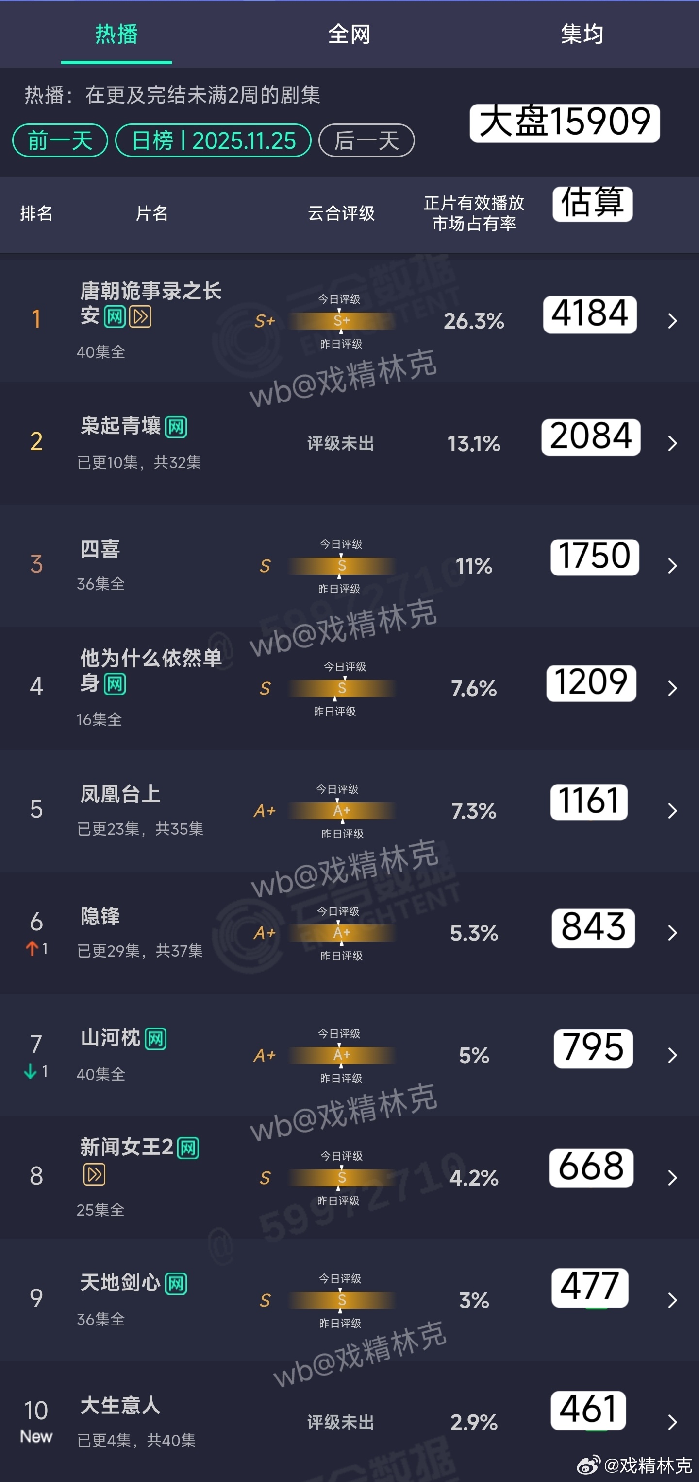 11.25云合估算:枭起青壤2084万。大生意人首日461万。