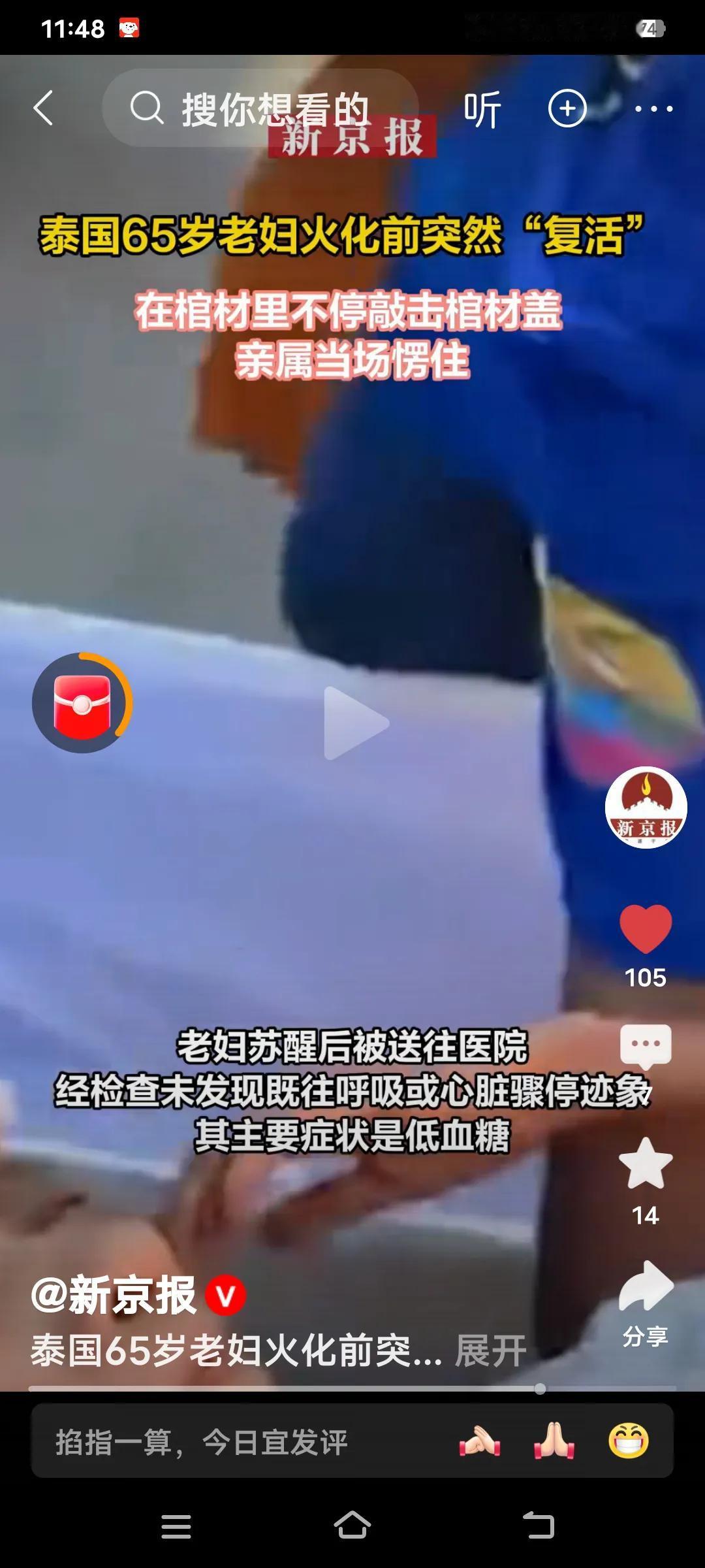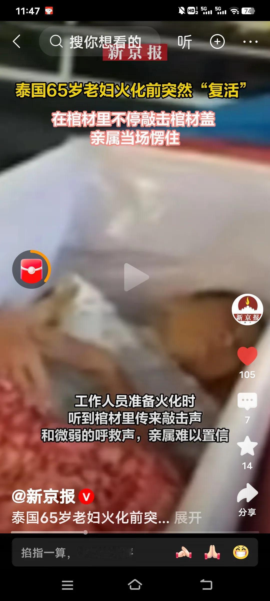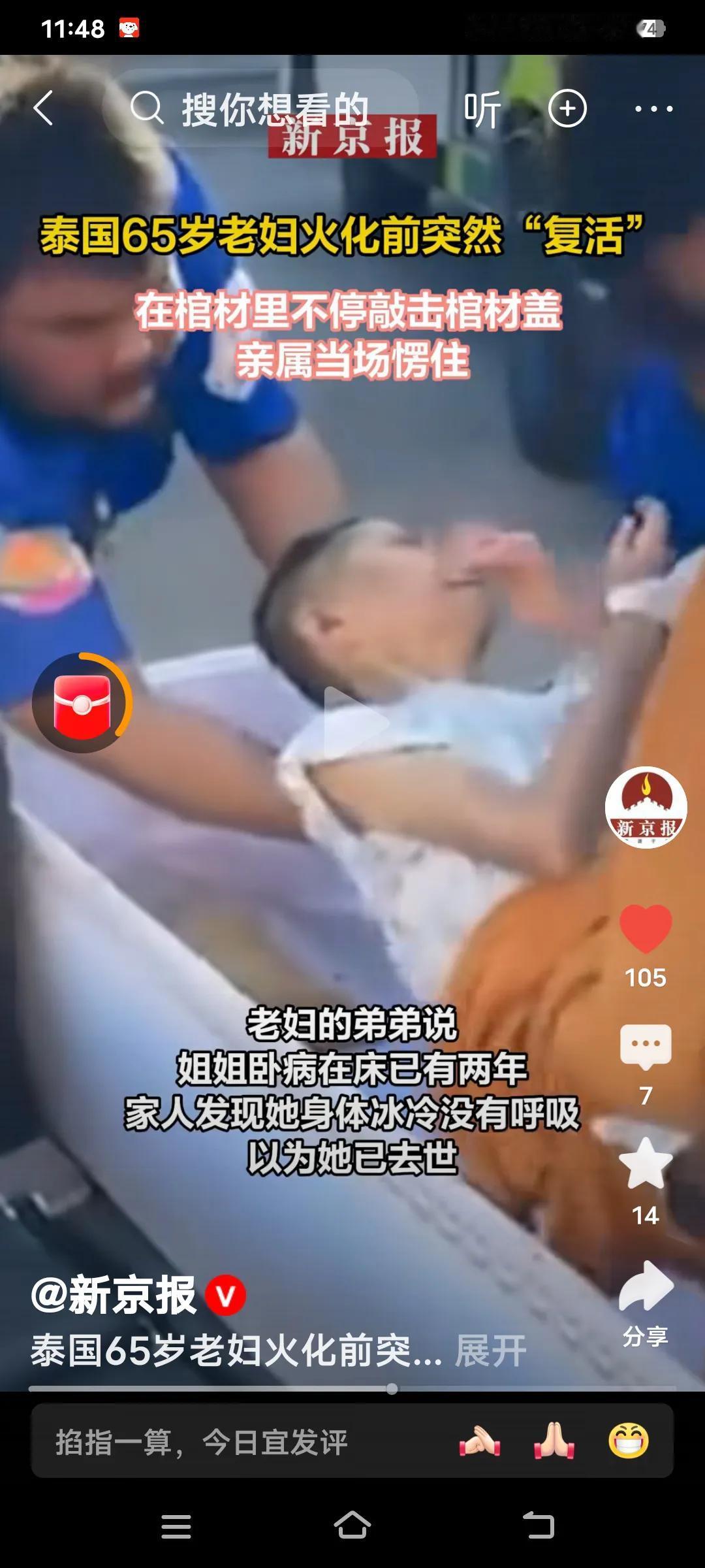 泰国一位65岁老妇,火化前突然“复活,”这可不是电视剧情,是现实的事情! 11月23日泰国一名65岁老妇在火化前“复活,”家人宣布死亡。将她放入白色棺材送往寺庙,工作人员准备火化时听到里面有敲击声和微弱的呼救声,亲属难以置信。 打开棺材一看果真事实,老妇苏醒后送往医院,医院检查说主要症状是低血糖,没有发现既往呼吸或心脏聚停止现象。 老妇的弟弟说,他姐姐卧床两年,家人发现她身体冰冷停止呼吸,以为她过世了! 还有这种情况,多少得有些区别吧,去世了,身体僵硬,应该没有一点好的状况呀!还好她在进火化的前苏醒了,不然把她火化了。家人也不知道她根本没有去世。 有些事情真的让人想象不到呀!这真是又从死亡的线上又捡了一条命呀!还算命大呀!想想自己当时的心情有多可怕呀?“咋了。我一个大活人,竟然把我给烧了[祈祷]”这以后就成了传说了!老太太离世 泰国王太后去世 泰国去世 大妈离奇死亡