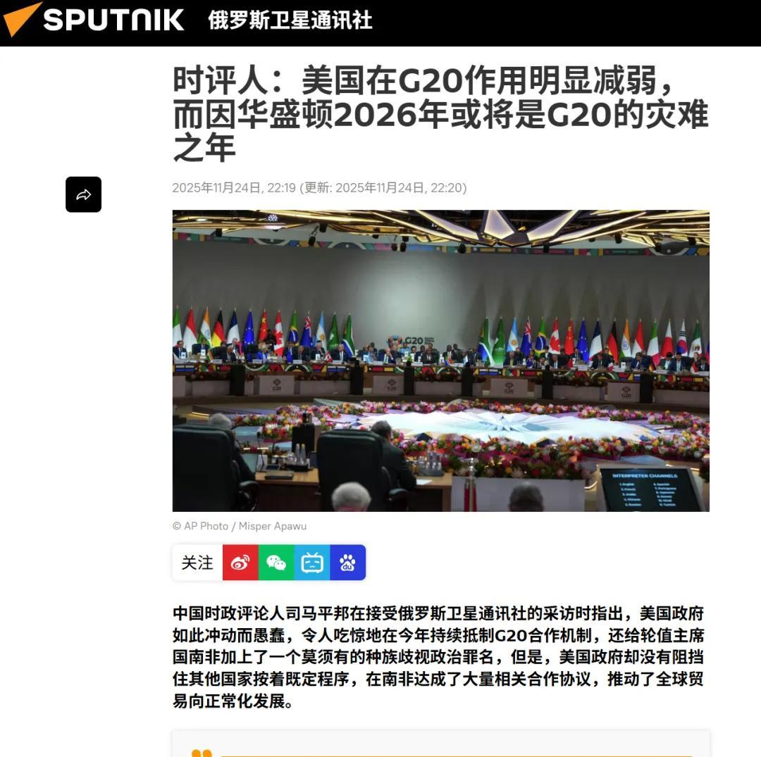 【非洲人已经不尿美国了!因特朗普接下轮值权,2026年或是G20灾难之年】俄罗斯卫星通讯社:2025年的G20峰会于11月24日在南非约翰内斯堡落幕,该峰会一整年都遭到了美国的无视,美国指责比勒陀利亚违反该国白人权利。值得注意的是,自12月1日起,美国将接任G20轮值主席国。您如何评论美国担任G20轮值主席国将带来的影响:1.美国如此冲动且模糊的政策,是否会在一定程度上阻碍G20的工作,特别是在全球南方国家(中国与俄罗斯密切互动的伙伴国)影响力日益增强的背景下?2.美国与中国的贸易矛盾将如何影响G20明年的运转?3.美国接任G20轮值主席国后,其所发挥的作用能否超越连续四届成功的金砖国家(印度尼西亚、印度、巴西和南非)担任轮值主席国时创造的成果?司马平邦:🔻其一,美国的特朗普政府如此冲动而愚蠢,令人吃惊地在今年持续抵制G20合作机制,还给轮值主席国南非加上了一个莫须有的种族歧视政治罪名,但是,他们却没有阻挡住其他国家按着既定程序,在南非达成了大量相关合作协议,推动了全球贸易向正常化发展;也出台了领导人联合宣言,这实际上已表明,美国在如G20峰会这样的全球顶级合作平台上的作用明显减弱了,就连加拿大的这样的美国小弟都认为,这个世界已经可以没有美国照样玩。但是,我觉得比较遗憾的是,G20机制居然还能允许由一个已经拒绝参加上届峰会的国家接任下一届G20峰会的轮值主席国,本届轮值主席国南非拒绝与美国交接的态度我认为是有力的,且有建设性的,这个世界就不该总是换着花样迁就美国,把这个没落的帝国主义国家体当成一个“霸权巨婴”哄来哄去。如果G20能够达成新机制,对美国的违规和错误进行适当惩罚,我认为对其可持续都是有利的,中俄及南南国家的增长速度已经比西方国家更快,世界贸易和经济的重心在明显转移着,美国本来就已经没那么重要了。而反过来,从美国现在针对G20张牙舞爪、无理取闹、霸权至上的表现看,当美国真的成为G20峰会主席国之后,2026年或者会为G20带来更多的不确定性,它刻意制造更多分裂,而不是促成更好的合作,2026年搞不好会是G20的灾难之年。🔻其二,我认为,从本届峰会达成的一些成果看,比如由中国和南非联合发布的《支持非洲现代化合作倡议》,标志着特朗普政府于今年4月发起的“万国关税战”至本届G20峰会可以告一段落了,美国针对全世界的单边主义贸易霸凌并没有对全球化贸易起到他们臆想中的重大破坏性作用,并没有完全绑架全世界。这里面很重要的一点,是中国在半年时间里强硬顶住了美国的关税战进攻,全球化贸易体系仍然按照既有的轨道在运行着,所以我认为接下来的2026年,即使美国还会有新的夭蛾子制造出来,但破坏的能量要小得多了,美国想借单边关税政策“抢劫”全世界的计划绝大部分都没有成功,倒是美国的一些重要盟友都受到了美国的欺负,那是它们自己内部的割韭菜游戏。其实,现在G20平台的大部分国家与中国都有着明显的制度性差异,在一些重大国际问题上,尤其是在俄乌冲突上也都有着明显的矛盾,但是,在大家在全球化贸易上还是有着密集的合作点的,中国如果想保持全球最大贸易体和全球最大制造业国家的体量,必须好好利用各种各样的全球贸易和经济合作平台,所以,中国不会在G20平台上跟美国人“一般见识”,比如,现在中国已经在实际履行对非洲的零关税承诺,当美国的自由贸易大门越来越窄时,全世界的贸易大门必须更加敞开。从现在到未来,我觉得都要清醒认识到,贸易保护和单边霸凌将成为美国对待全世界贸易伙伴的定量性政策,但这对中国来说也并不全是坏事,因为既然已经如此,那就不如如此,美国退场之后,这个世界留给中国的合作机会一定会越来越多。🔻其三,美国接任G20轮值主席国之后,我看它最大的动力就是可以使用这个全球合作平台的机制对中国继续实施排挤和打压,但在这个世界上,在全球贸易方面,不跟中国进行公平合作,谁都不会有好果子吃,谁都是自讨苦吃。2025年,特朗普政府发动的“万国关税战”的一个重要成果是获得了其数个重要贸易伙伴/同盟国家的投资承诺,这是美国令人显著羡慕的一面,但是在另一面,美国还是没办法真正重振制造业,无法生产出更多可以与中国相抗衡的制造品,其人工智能产业发展虽然一枝独秀,但更像是一个巨大的高技术泡沫,根本不能赋能美国产品行销于全世界,小到贸易逆差,大到美元债务,美国经济所面临被动局面很难获得改变。所以,在2026年,全世界都应该小心再小心美国会使用G20平台把国内的经济危机输出给全世界,美国虽然本身经济体量庞大,但根本无法重现之前金砖国家担任轮值主席国创造的成果。现在的世界,以美国为代表的传统西方国家都越来越草台班子化,主要在于其经济体内部增长非常疲软乏力,有的经济体甚至是负增长,但西方在全球贸易合作中仍然惯于傲慢地附加政治正确要件,正如欧洲国家在本届G20峰会期间达成的关于俄乌冲突的和平协议,其实满篇都是根本就无法实际执行的政治正确废话,最后只有一个结果是确认的,乌克兰一定会被葬送掉。美国正在试图给G20带来一场灾难,所有成员国家都要做好准备。(本文为俄罗斯卫星通讯社对司马平邦的访问)网页链接