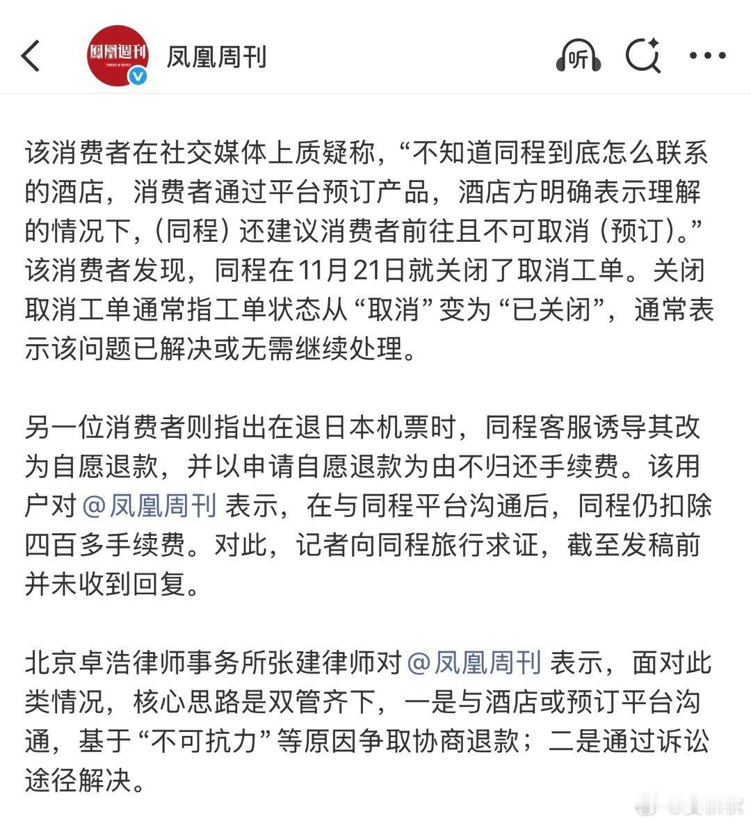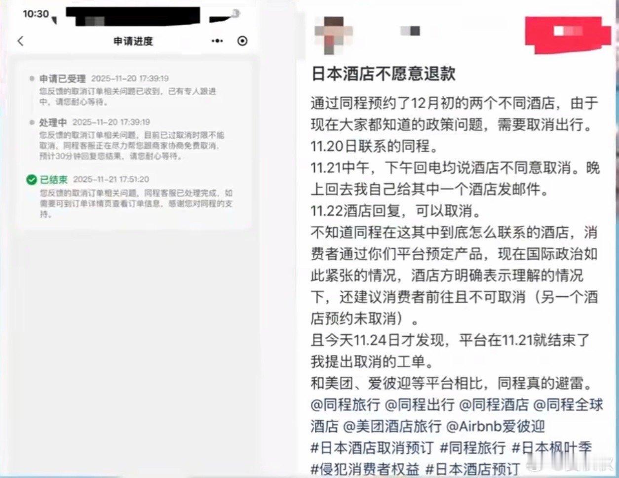 吃相太难看大批中国游客取消日本行后,面对退费的尴尬。而我必须要说,某些平台的吃相,太难看了。根据《凤凰网财经》,旅行社业务员陈娜表示,短短数日,陈娜的旅行社,已有五六十名游客取消了赴日行程。这个数目,占她公司近期日本游客的八成左右。陈娜表示,自己所在公司的酒店预订,分两种途径:一种是直接与日本酒店对接,另一种是通过国内平台预订。她发现,直接联系日本酒店的订单,即便出发前10天内取消,大多都能顺利退费;但通过平台预订的订单,退费相对困难。“平台规定提前15天就收取酒店费用,但实际上日本酒店并不会如此早地锁定费用。”陈娜说,她多次与平台客服交涉退费问题,对方都以“与供应商协商无果”为由拒绝,于是她只好直接联系日本酒店,推动解决。“有时日本酒店同意退费,平台也只能退了。”“所以有时候,我们不愿意在平台网站订,而是选择国外的平台,规则比较合适,比如入住前1天、前2天可以取消。”此外,根据“凤凰周刊”,社交平台上多名消费者反映,在同程旅游平台遭遇“退费难”的问题。一位消费者在社交平台发文称,自己在同程旅行预订了两家日本的酒店,取消行程时先联系了同程,11月21日被同程告知,酒店不同意取消预订。当日,该消费者邮件联系其中一家酒店,并在11月22日收到酒店回复称,可以取消。该消费者质疑称,“不知道同程到底怎么联系的酒店,消费者通过平台预订产品,酒店方明确表示理解的情况下,还建议消费者前往且不可取消(预订)。”另一位消费者则指出,在退日本机票时,同程客服诱导其改为自愿退款,并以申请自愿退款为由,扣除四百多手续费。其实,如今的情况下,旅客受损,平台确实也会受损。关键问题是,平台要体现出社会责任感,而不是“拆东墙补西墙”,甚至鼓励游客继续行程。如此,下一次老百姓“用脚投票”,平台又该如何自处呢?遇日本酒店难退订律师建议可诉讼日本退订潮同程被指退费和稀泥高市早苗晏秋秋