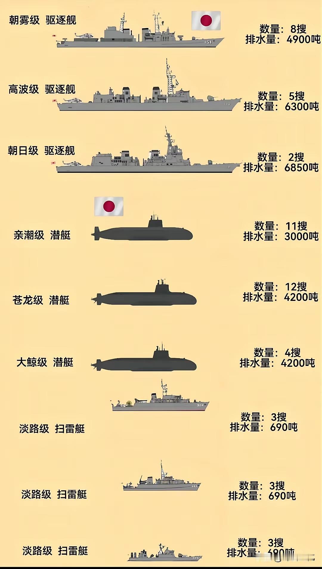 看日本的海上武装力量实力,真的是不得不防海自的野心啊。 在日本海军里,驱逐舰和护卫舰的吨位,都超过了3000吨级别之上了,造出来的都是大舰来的,你说这目的是何在? 一个战败国,海军实力远超五常中的三常,这事要拿到联合国讨论一下,要么主动裁军,要么启动敌国条款,中俄代表五常给他削了,对待这种国家真的要去武装化才行……