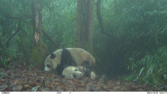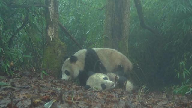 野外布设红外相机拍摄到的野生大熊猫母子活动画面。