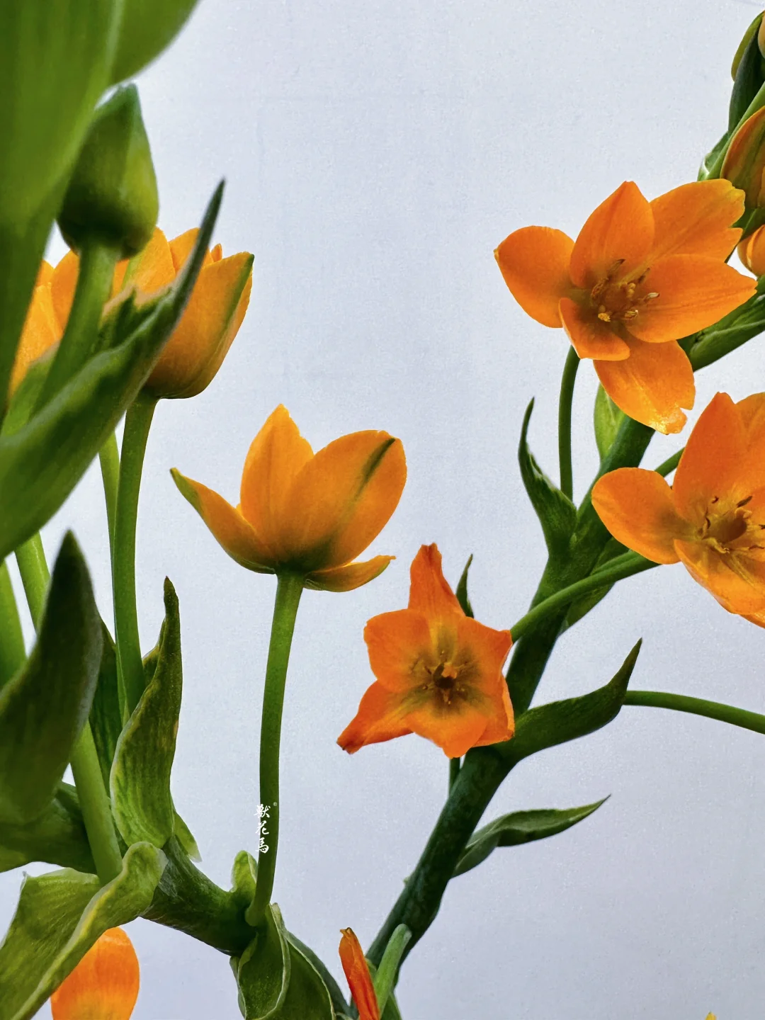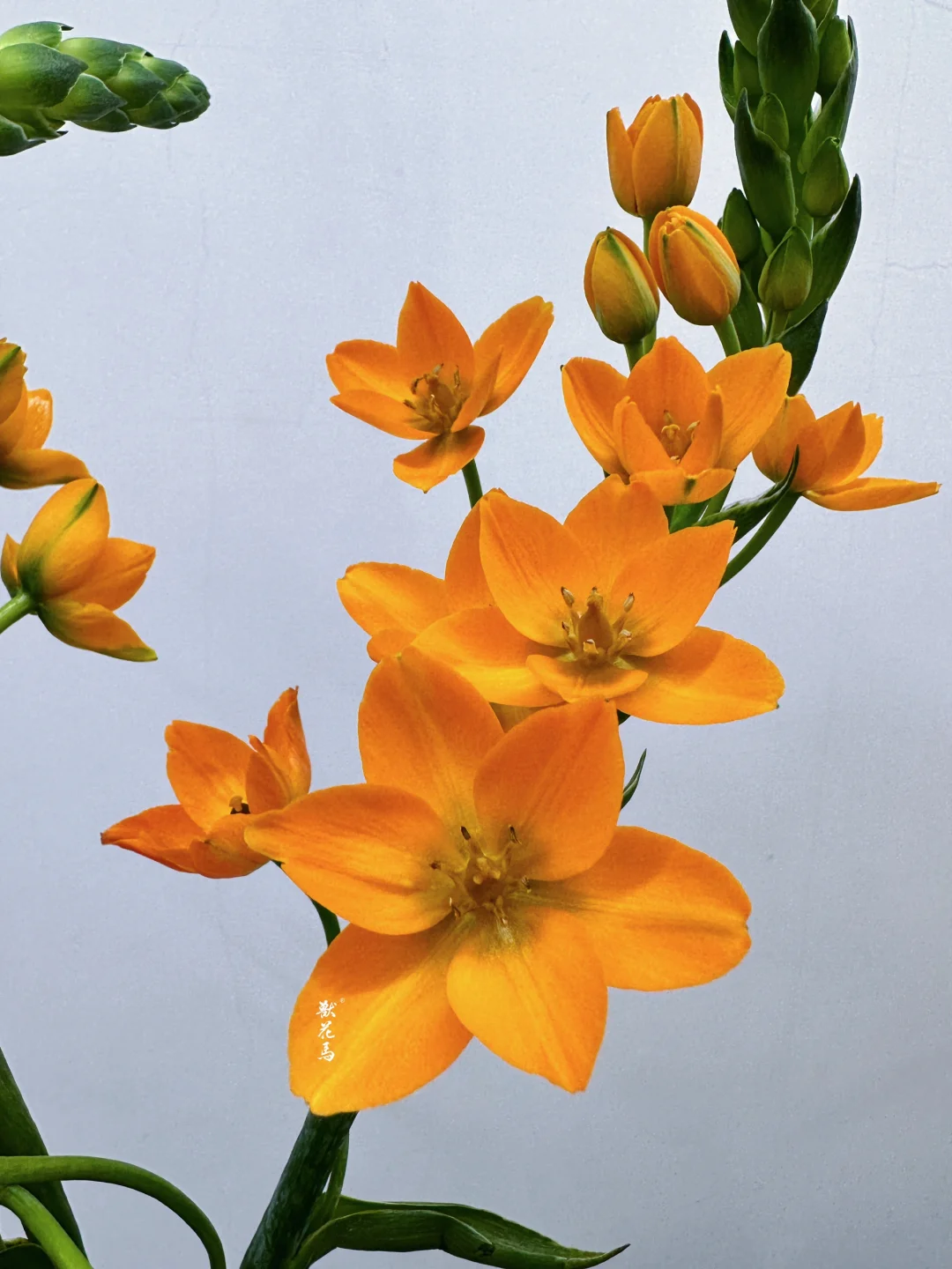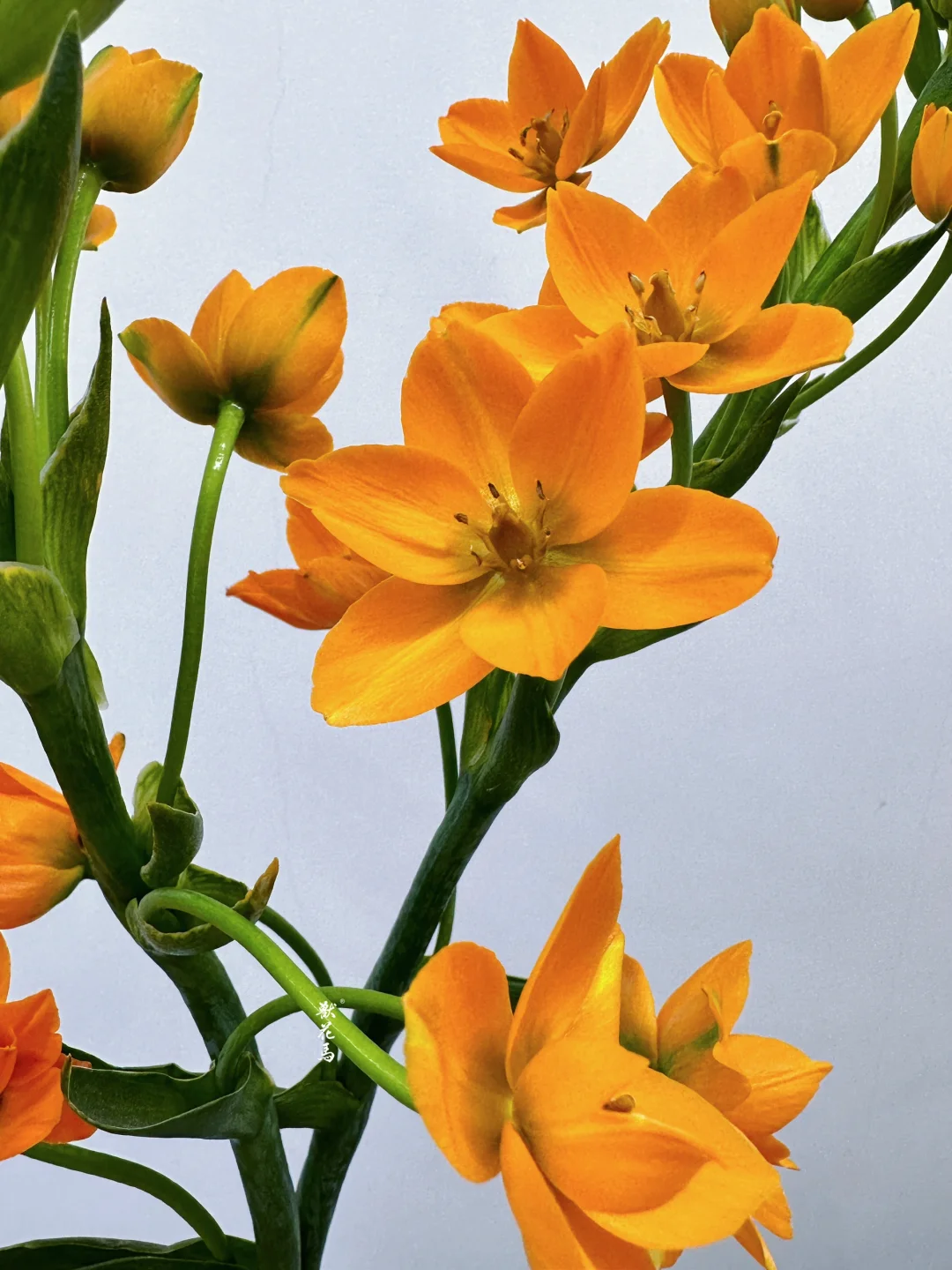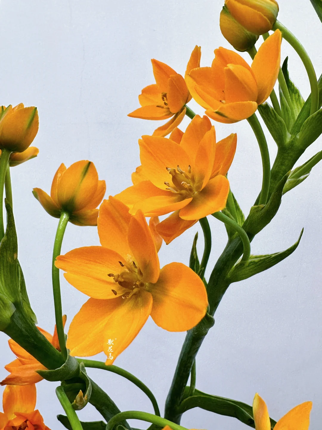 花材:圣心百合 学名:Ornithogalum dubium Houtt. 花语:纯洁、坚韧 花期:鲜切15-20天左右 特点: 圣心百合是花期很长的花材,是极少数不用水就可以养的花材,花期可达20天以上,花苞从下往上依次开放, 在浅水养护到花苞开过一两排后,即可脱水瓶插,可靠自身养分开花直至开完。 修剪: 根据花瓶高度需要平剪根; 水位: 5-10公分 注意: 不要放在阳光暴晒和出风口的地方 🌈|TIPS|长按自取|感谢喜欢|欢迎分享